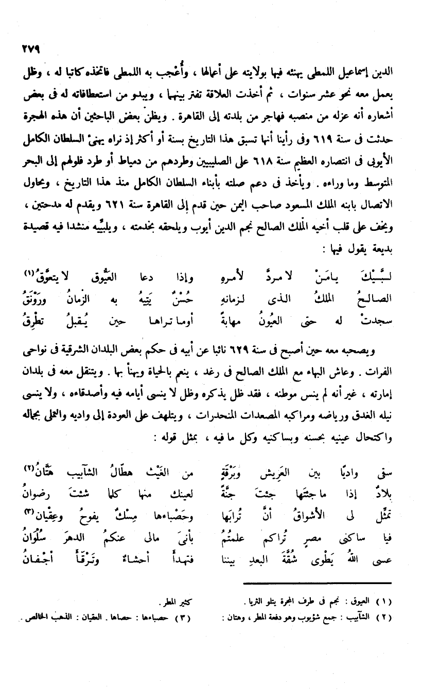 الدين إسماعيل اللمطى يهنئه فيها بولايته على أعمالها، وأعجب به اللمطى فاتخذه كاتبا له، وظل يعمل معه نحو عشر سنوات، ثم أخذت العلاقة تفتر بينهما، ويبدو من استعطافاته له فى بعض أشعاره أنه عزله من منصبه فهاجر من بلدته إلى القاهرة. ويظن بعض الباحثين أن هذه الهجرة حدثت فى سنة 619 وفى رأينا أنها تسبق هذا التاريخ بسنة أو أكثر إذ نراه يهنئ السلطان الكامل الأيوبى فى انتصاره العظيم سنة 618 على الصليبيين وطردهم من دمياط أو طرد فلولهم إلى البحر المتوسط وما وراءه. ويأخذ فى دعم صلته بأبناء السلطان الكامل منذ هذا التاريخ، ويحاول الاتصال بابنه الملك المسعود صاحب اليمن حين قدم إلى القاهرة سنة 621 ويقدم له مدحتين، ويخف على قلب أخيه الملك الصالح نجم الدين أيوب ويلحقه بخدمته، ويلبيّيه منشدا فيه قصيدة بديعة يقول فيها: