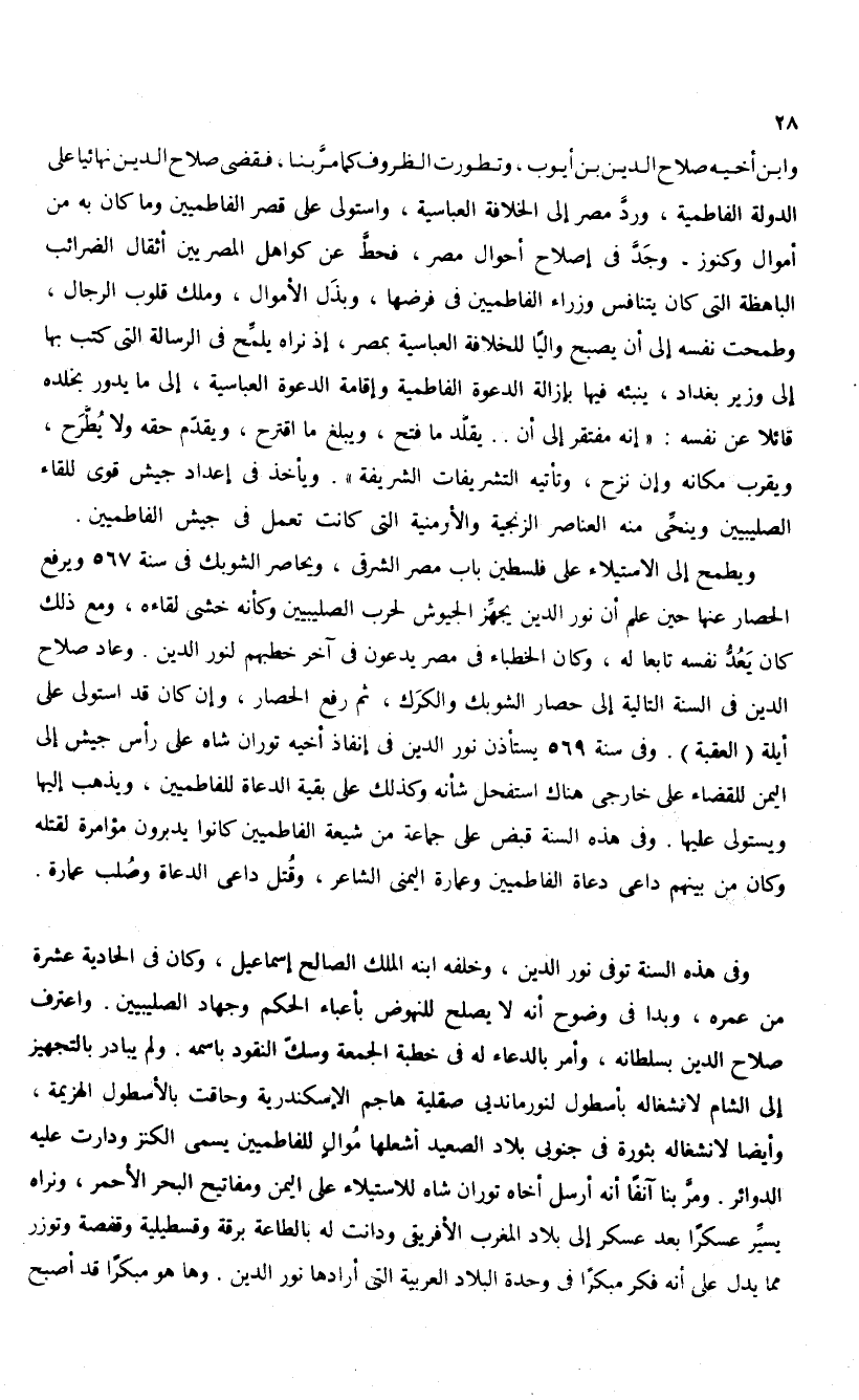 وابن أخيه صلاح الدين بن أيوب، وتطورت الظروف كما مرّبنا، فقضى صلاح الدين نهائيا على الدولة الفاطمية، وردّ مصر إلى الخلافة العباسية، واستولى على قصر الفاطميين وما كان به من أموال وكنوز. وجدّ فى إصلاح أحوال مصر، فحطّ عن كواهل المصريين أثقال الضرائب الباهظة التى كان يتنافس وزراء الفاطميين فى فرضها، وبذل الأموال، وملك قلوب الرجال، وطمحت نفسه إلى أن يصبح واليا للخلافة العباسية بمصر، إذ نراه يلمّح فى الرسالة التى كتب بها إلى وزير بغداد، ينبئه فيها بإزالة الدعوة الفاطمية وإقامة الدعوة العباسية، إلى ما يدور بخلده قائلا عن نفسه: «إنه مفتقر إلى أن. . يقلّد ما فتح، ويبلغ ما اقترح، ويقدّم حقه ولا يطّرح، ويقرب مكانه وإن نزح، وتأتيه التشريفات الشريفة». ويأخذ فى إعداد جيش قوى للقاء الصليبيين وينحّى منه العناصر الزنجية والأرمنية التى كانت تعمل فى جيش الفاطميين.