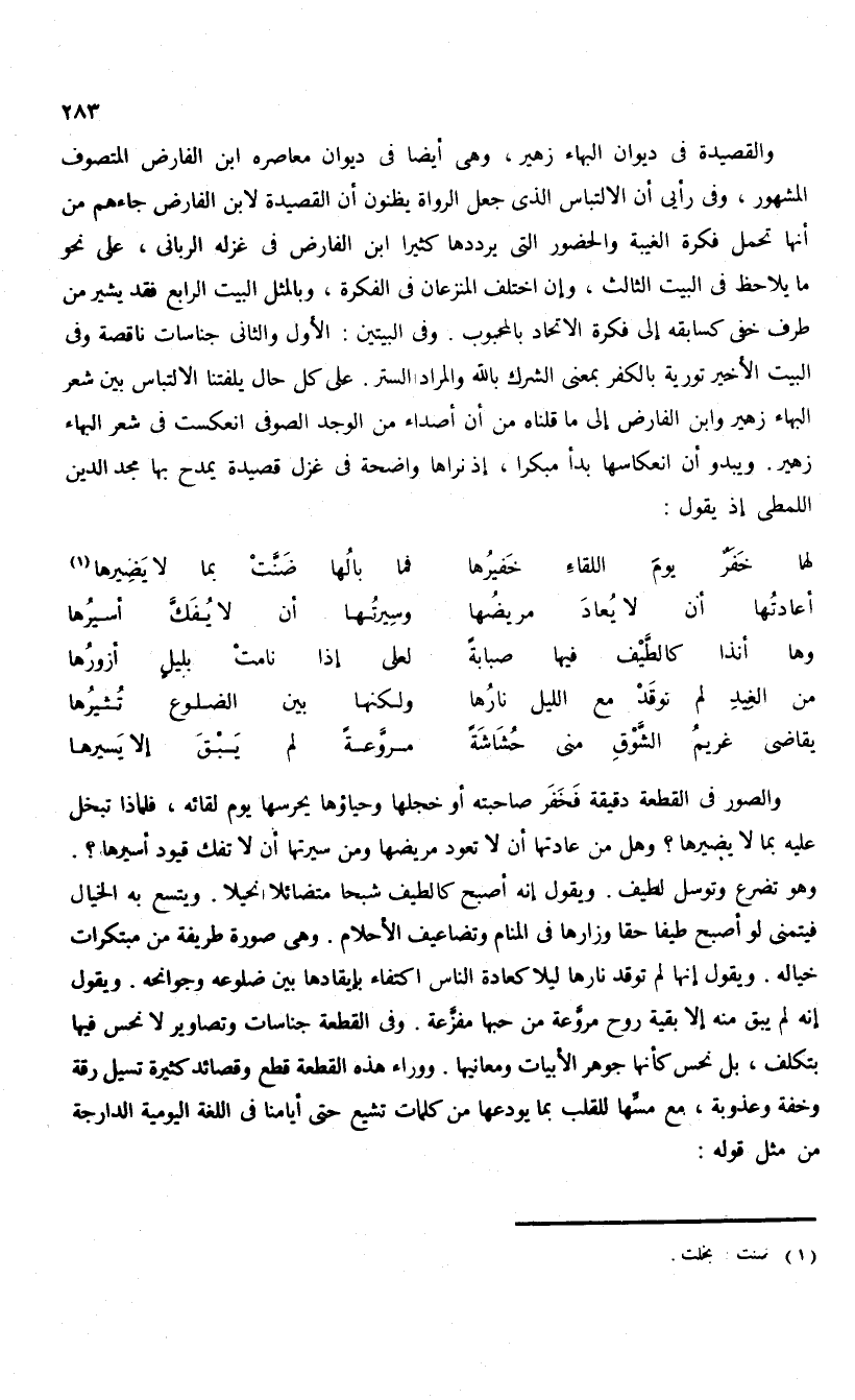 والقصيدة فى ديوان البهاء زهير، وهى أيضا فى ديوان معاصره ابن الفارض المتصوف المشهور، وفى رأيى أن الالتباس الذى جعل الرواة يظنون أن القصيدة لابن الفارض جاءهم من أنها تحمل فكرة الغيبة والحضور التى يرددها كثيرا ابن الفارض فى غزله الربانى، على نحو ما يلاحظ فى البيت الثالث، وإن اختلف المنزعان فى الفكرة، وبالمثل البيت الرابع فقد يشير من طرف خفى كسابقه إلى فكرة الاتحاد بالمحبوب. وفى البيتين: الأول والثانى جناسات ناقصة وفى البيت الأخير تورية بالكفر بمعنى الشرك بالله والمراد الستر. على كل حال يلفتنا الالتباس بين شعر البهاء زهير وابن الفارض إلى ما قلناه من أن أصداء من الوجد الصوفى انعكست فى شعر البهاء زهير. ويبدو أن انعكاسها بدأ مبكرا، إذ نراها واضحة فى غزل قصيدة يمدح بها مجد الدين اللمطى إذ يقول: