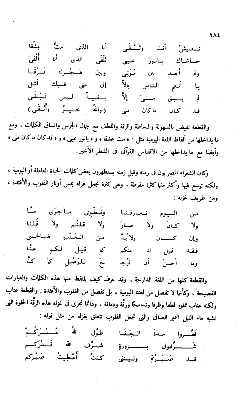 والقطعة كلها من اللغة الدارجة، وقد عرف كيف يلتقط منها هذه الكلمات والعبارات الفصيحة، وكأنها لا تفصل من لغتنا اليومية، بل تفصل من القلوب والأفئدة. والقطعة عتاب ولكنه عتاب مملوء لطفا وظرفا وتسامحا ورقّة ودماثة، ودائما تجرى فى غزله هذه الرقّة الحلوة التى تشبه ماء النيل النمير الصافى والتى تجعل القلوب تتعلق بغزله من مثل قوله: