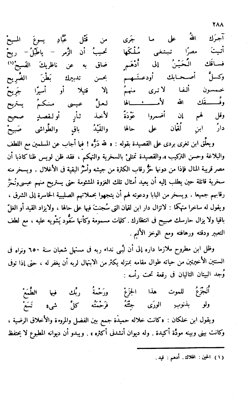 ويعلّق ابن تغرى بردى على القصيدة بقوله: «لله درّه! فيما أجاب عن المسلمين مع اللطف والبلاغة وحسن التركيب». والقصيدة تمتلئ بالسخرية والتهكم، فقد ظن لويس ظنا كاذبا أن مصر قريبة المنال فإذا من دونها حزّ رقاب الكثرة من جيشه وأسر البقية فى الأغلال. ويسخر منه سخرية قاتلة حين يطلب إليه أن يعيد أمثال تلك الغزوة المشئومة حتى يستريح منهم عيسى وتحزّ رقابهم جميعا. ويسخر من البابا ودعوته لهم أن يتجهوا بحملاتهم الصليبية الخاسرة إلى الشرق، ويقول له ساخرا متهكما: لا تزال دار ابن لقمان التى سجنت فيها على حالها، ولا يزاد القيد أو الغلّ باقيا ولا يزال حارسك صبيح فى انتظارك. كلمات مسمومة وكأنها سفّود يشويه عليه، مع لطف التعبير ودقته ورهافته ومع الوخز الأليم.