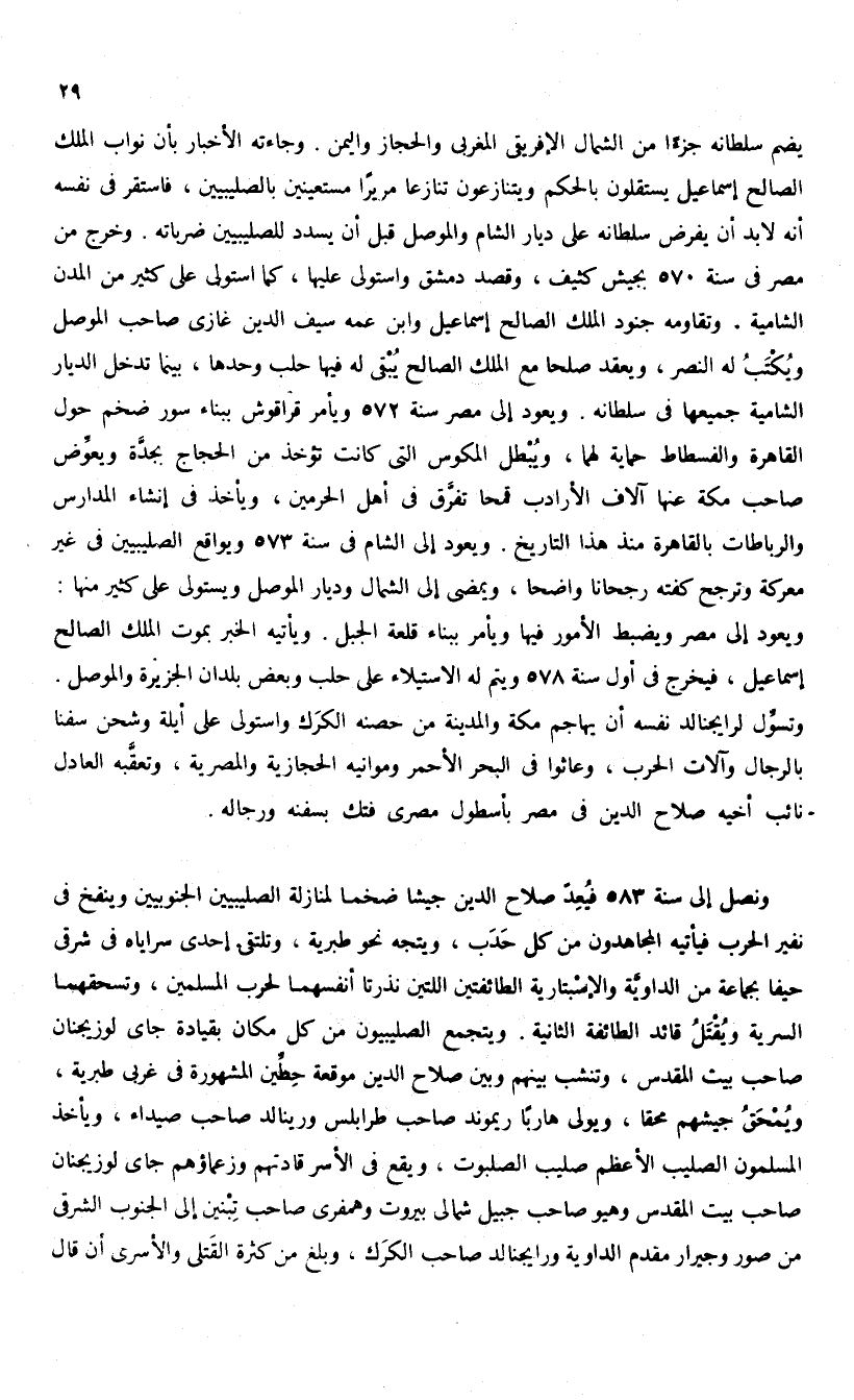 ونصل إلى سنة 583 فيعدّ صلاح الدين جيشا ضخما لمنازلة الصليبيين الجنوبيين وينفخ فى نفير الحرب فيأتيه المجاهدون من كل حدب، ويتجه نحو طبرية، وتلتقى إحدى سراياه فى شرقى حيفا بجماعة من الداويّة والإسبتارية الطائفتين اللتين نذرتا أنفسهما لحرب المسلمين، وتسحقهما السرية ويقتل قائد الطائفة الثانية. ويتجمع الصليبيون من كل مكان بقيادة جاى لوزيجنان صاحب بيت المقدس، وتنشب بينهم وبين صلاح الدين موقعة حطّين المشهورة فى غربى طبرية، ويمحق جيشهم محقا، ويولى هاربا ريموند صاحب طرابلس ورينالد صاحب صيداء، ويأخذ المسلمون الصليب الأعظم صليب الصلبوت، ويقع فى الأسر قادتهم وزعماؤهم جاى لوزيجنان صاحب بيت المقدس وهيو صاحب جبيل شمالى بيروت وهمفرى صاحب تبنين إلى الجنوب الشرقى من صور وجيرار مقدم الداوية ورايجنالد صاحب الكرك، وبلغ من كثرة القتلى والأسرى أن قال