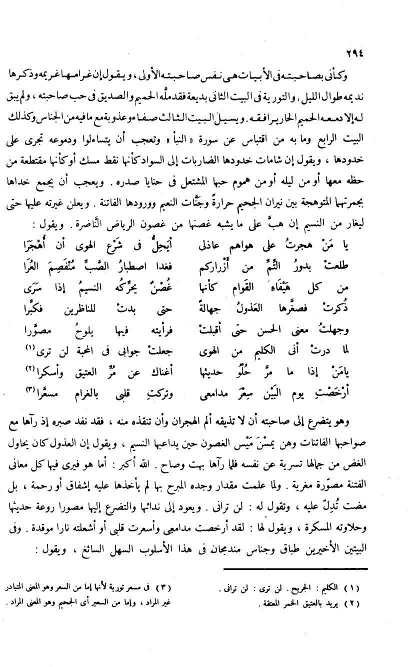 وكأنى بصاحبته فى الأبيات هى نفس صاحبته الأولى، ويقول إن غرامها غريمه وذكرها نديمه طوال الليل، والتورية فى البيت الثانى بديعة فقد ملّه الحميم والصديق فى حب صاحبته، ولم يبق له إلا دمعه الحميم الحار يرافقه. ويسيل البيت الثالث صفاء وعذوبة مع ما فيه من الجناس وكذلك البيت الرابع وما به من اقتباس عن سورة «النبأ» وتعجب أن يتساءلوا ودموعه تجرى على خدودها، ويقول إن شامات خدودها الضاربات إلى السواد كأنها نقط مسك أو كأنها مقتطعة من حظه معها أو من ليله أو من هموم حبها المشتعل فى حنايا صدره. ويعجب أن يجمع خداها بجمرتهما المتوهجة بين نيران الجحيم حرارة وجنّات النعيم وورودها الفاتنة. ويعلن غيرته عليها حتى ليغار من النسيم إن هبّ على ما يشبه غصنها من غصون الرياض النّاضرة. ويقول: