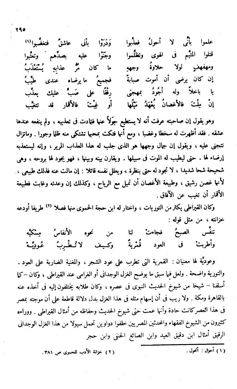 وعوديّة لها معنيان: القمرية التى تطرب على عود الشجر، والمغنية الضاربة على العود، والتورية واضحة. ولعل فيما سبق ما يوضح الغزل الوجدانى أو الغرامى عند القيراطى، وكان-كما أسلفنا-شيخا من شيوخ الحديث النبوى فى عصره، وكان طلابه يختلفون إليه فى أخذه عنه بالقاهرة ومكة. ولا ريب فى أن إسهام مثله فى هذا الغزل يدل دلالة قاطعة على أن موجته بمصر فى هذا العصر كانت حادة وأنها عمت حتى شيوخ الحديث وحفاظه من أمثال القيراطى. ووراءه كثيرون من الشيوخ الفقهاء والمحدثين المصريين خلفوا دواوين تحمل سيولا من هذا الغزل الوجدانى الرقيق أمثال ابن دقيق العيد وابن الصائغ الحنفى وابن حجر