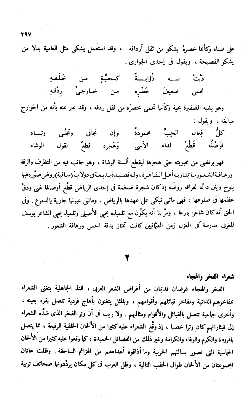 على ضناه وكأنما خصره يشكو من ثقل أردافه، وقد استعمل يشكى مثل العامية بدلا من يشكو الفصيحة، ويقول فى إحدى الجوارى.
