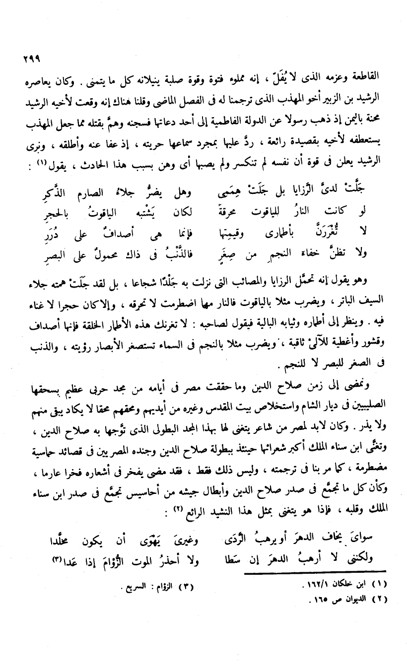 القاطعة وعزمه الذى لا يفلّ، إنه مملوء فتوة وقوة صلبة ينيلانه كل ما يتمنى. وكان يعاصره الرشيد بن الزبير أخو المهذب الذى ترجمنا له فى الفصل الماضى وقلنا هناك إنه وقعت لأخيه الرشيد محنة باليمن إذ ذهب رسولا عن الدولة الفاطمية إلى أحد دعاتها فسجنه وهمّ بقتله مما جعل المهذب يستعطفه لأخيه بقصيدة رائعة، ردّ عليها بمجرد سماعها حريته، إذ عفا عنه وأطلقه، ونرى الرشيد يعلن فى قوة أن نفسه لم تنكسر ولم يصبها أى وهن بسبب هذا الحادث، يقول (¬1):