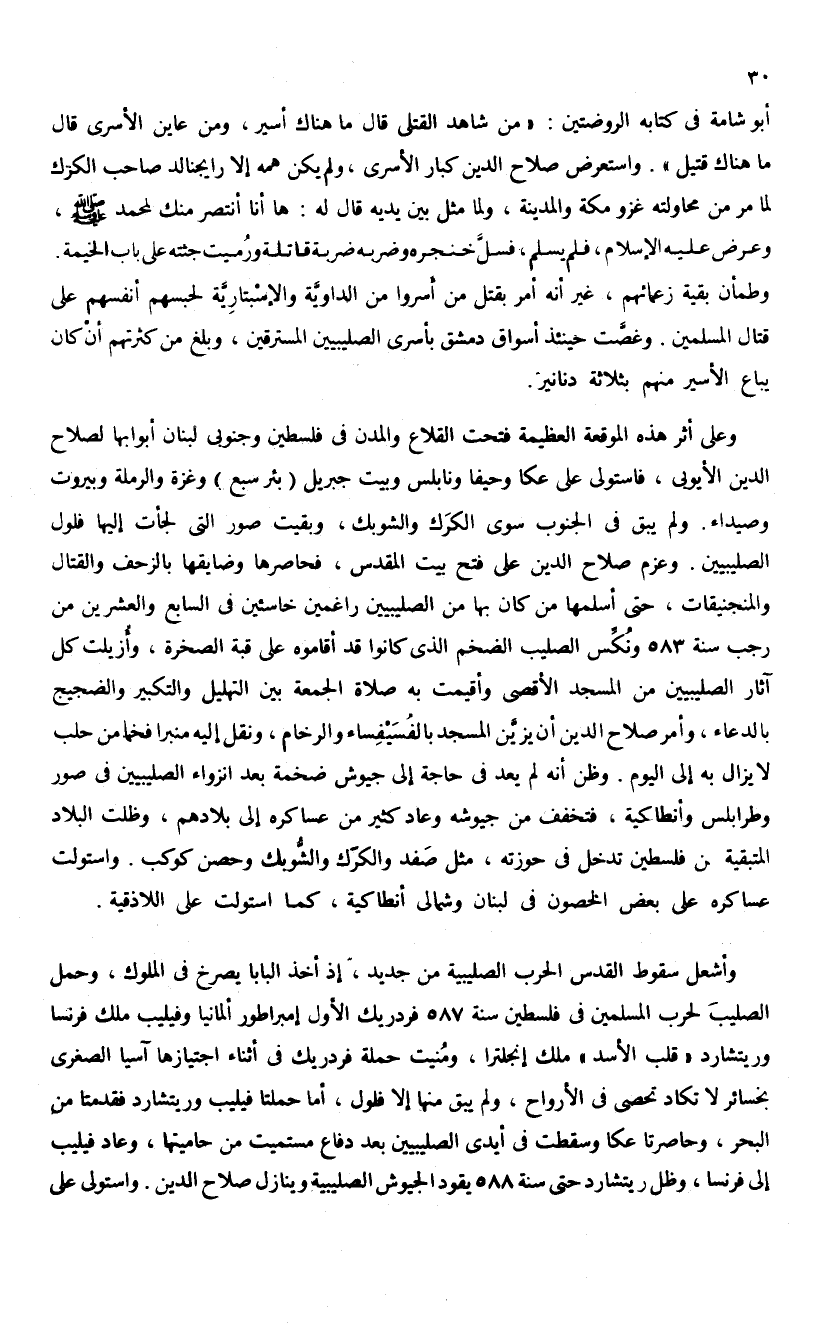 أبو شامة فى كتابه الروضتين: «من شاهد القتلى قال ما هناك أسير، ومن عاين الأسرى قال ما هناك قتيل». واستعرض صلاح الدين كبار الأسرى، ولم يكن همه إلا رايجنالد صاحب الكرك لما مر من محاولته غزو مكة والمدينة، ولما مثل بين يديه قال له: ها أنا أنتصر منك لمحمد صلّى الله عليه وسلم، وعرض عليه الإسلام، فلم يسلم، فسلّ خنجره وضربه ضربة قاتلة ورميت جثته على باب الخيمة.