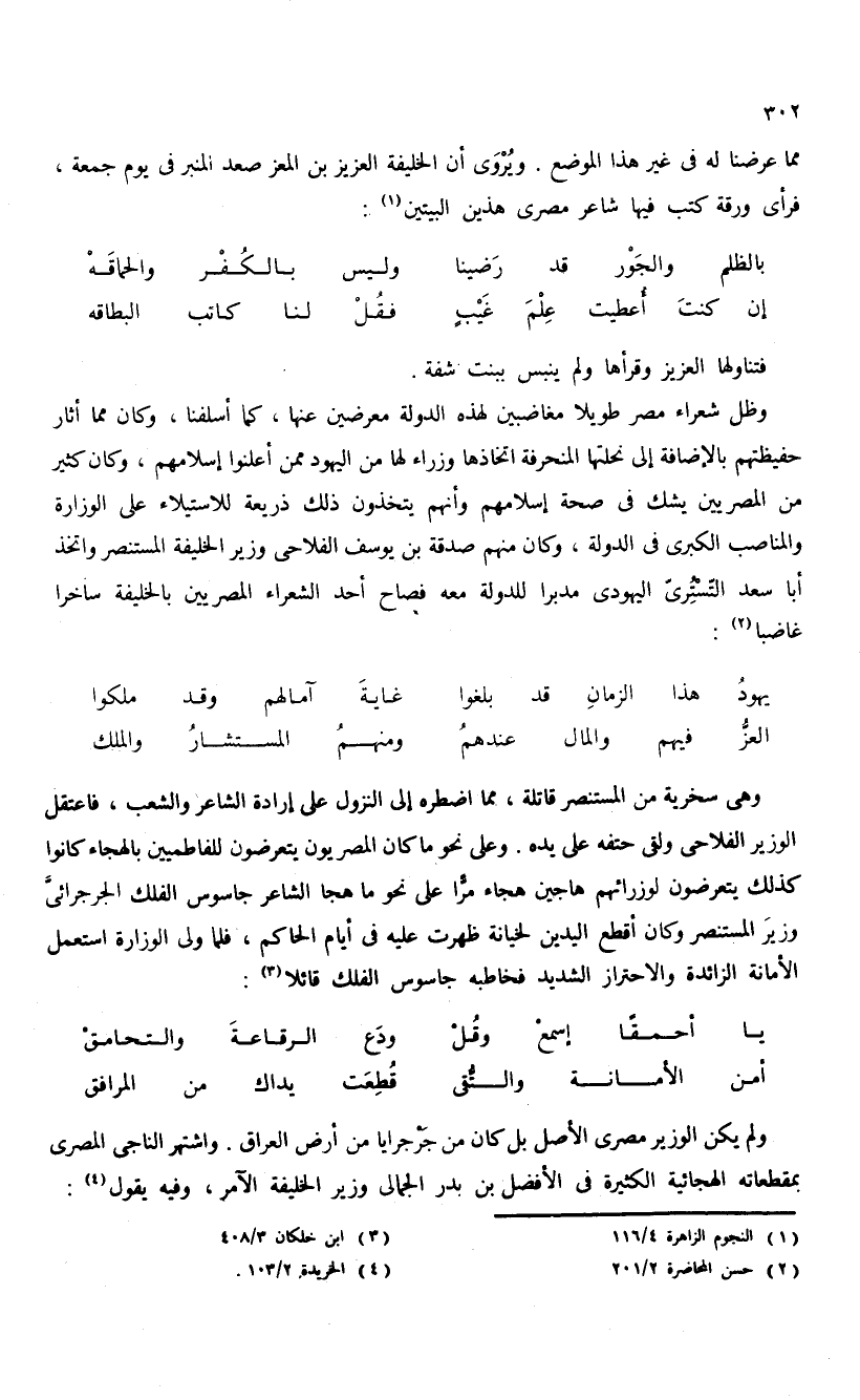 مما عرضنا له فى غير هذا الموضع. ويروى أن الخليفة العزيز بن المعز صعد المنبر فى يوم جمعة، فرأى ورقة كتب فيها شاعر مصرى هذين البيتين (¬1):