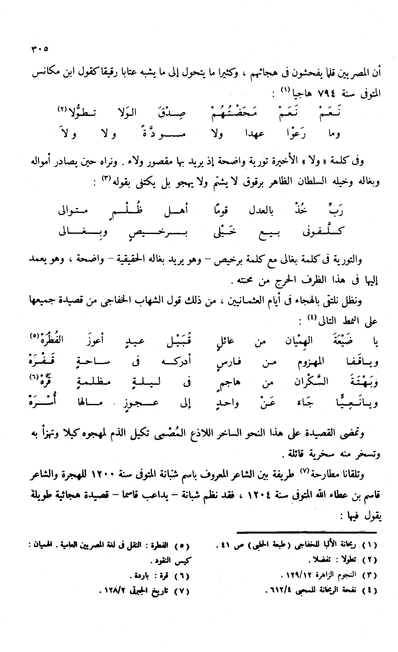 أن المصريين قلما يفحشون فى هجائهم، وكثيرا ما يتحول إلى ما يشبه عتابا رقيقا كقول ابن مكانس المتوفى سنة 794 هاجيا (¬1):