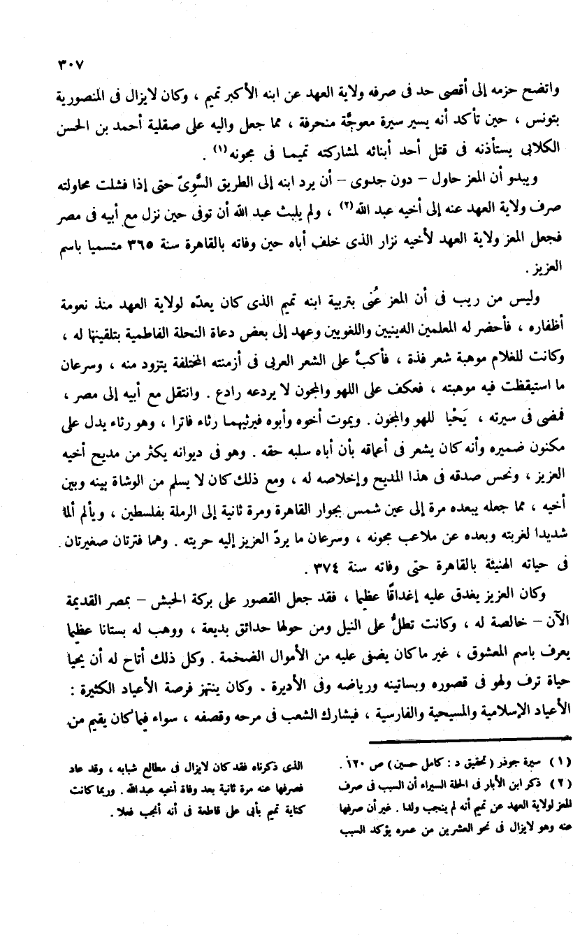 (¬2) ذكر ابن الأبار فى الحلة السيراء أن السبب فى صرف المعز لولاية العهد عن تميم أنه لم ينجب ولدا. غير أن صرفها عنه وهو لا يزال فى نحو العشرين من عمره يؤكد السبب الذى ذكرناه فقد كان لا يزال فى مطالع شبابه، وقد عاد فصرفها عنه مرة ثانية بعد وفاة أخيه عبد الله. وربما كانت كناية تميم بأبى على قاطعة فى أنه أنجب فعلا.
