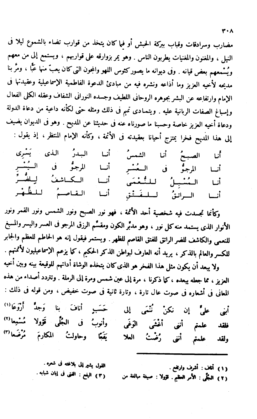 وكأنما تجسدت فيه شخصية أحد الأئمة، فهو نور الصبح ونور الشمس ونور القمر ونور الأنوار الذى يستمد منه كل نور، وهو مدبّر الكون ومقسّم الرزق المرجو فى العسر واليسر والمسبغ للنعمى والكاشف للضر الراتق للفتق القاصم للظهر. ويستمر فيقول إنه هو الحاطم للعظم والجابر للكسر والعالم بالذكر، يريد أنه العارف لبواطن الذكر الحكيم، كما يزعم الإسماعيليون لأئمتهم.