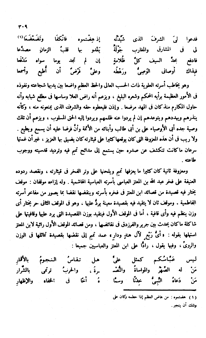 وهو يخاطب أسرته العلوية ذات الحسب العالى والحظ العظيم واضعا بين يديها شجاعته ونفوذه فى الأمور العظيمة برأيه المحكم وشعره البليغ، ويزعم أنه راض العلا وساسها فى مطلع شبابه وأنه حاول المكارم منذ كان فى المهد مرضعا. وإذن فليعطوه حقه والشرف الذى يمنعونه منه، وكأنه ينذرهم ويهددهم ويتوعدهم إن لم يردوا عنه ظلمهم ويردوا إليه الحق المسلوب، ويزعم أن تلك وصية جده أبى الأوصياء على بن أبى طالب وأبنائه من الأئمة وأنّ فرضا عليه أن يسمع ويطيع.