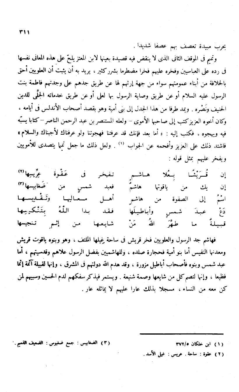 وتميم فى الموقف الثانى الذى لا ينقض فيه قصيدة بعينها لابن المعتز يلحّ على هذه المعانى نفسها فى رده على العباسيين وفخره عليهم فخرا مضطرما بشرر كثير، يريد به أن يثبت أن العلويين أحق بالخلافة من أبناء عمومتهم سواء من جهة إرثهم لها عن طريق جدهم على وجدتهم فاطمة بنت الرسول عليه السلام أو عن طريق وصاية الرسول بها لعلى أو عن طريق خدماته الجلّى للدين الحنيف ونصره. ويمد طرفا من هذا الجدل إلى بنى أمية وهو يقصد أصحاب الأندلس فى أيامه، وكان أخوه العزيز كتب إلى صاحبها الأموى-ولعله المستنصر بن عبد الرحمن الناصر-كتابا يسبّه فيه ويهجوه، فكتب إليه: «أما بعد فإنك قد عرفتنا فهجوتنا ولو عرفناك لأجبناك والسلام» فاشتد ذلك على العزيز وأفحمه عن الجواب (¬1). ولعل ذلك ما جعل تميما يتصدى للأمويين ويفخر عليهم بمثل قوله: