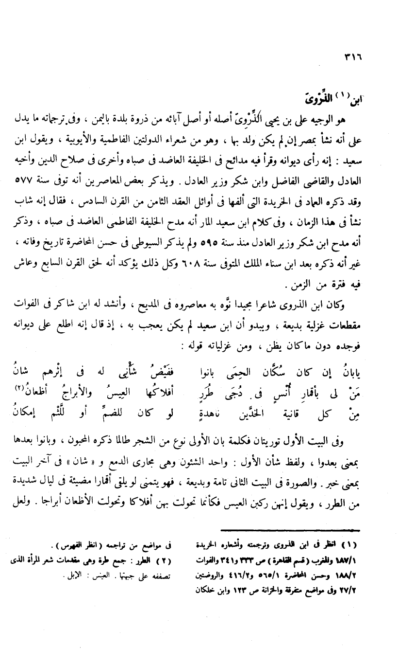 (¬1) انظر فى ابن الذروى وترجمته وأشعاره الخريدة 1/ 187 والمغرب (قسم القاهرة) ص 333 و 341 والفوات 2/ 188 وحسن المحاضرة 1/ 565 و 2/ 416 والروضتين 2/ 27 وفى مواضع متفرقة والخزانة ص 123 وابن خلكان فى مواضع من تراجمه (انظر الفهرس).