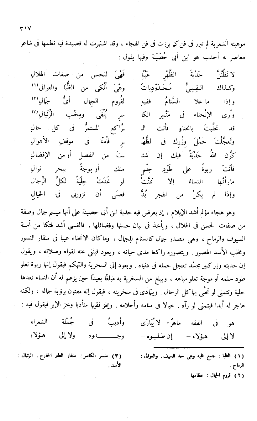 وهو هجاء مؤلم أشد الإيلام، إذ يعرض فيه حدبة ابن أبى حصينة على أنها ميسم جمال وصفة من صفات الحسن فى الهلال، ويأخذ فى بيان حسنها وفضائلها، فالقسى أشد فتكا من أسنة السيوف والرماح، وهى مصدر جمال كالسنام للجمال، وما كان الانحناء عيبا فى منقار النسور ومخلب الأسد الهصور. ويتصوره راكعا مدى حياته، ويعود فينفى عنه تقواه وصلاته، ويقول إن حدبته وزر كبير مجسّد تعجل حمله فى دنياه. ويعود إلى السخرية والتهكم فيقول إنها ربوة تعلو طود حلمه أو موجة تعلو مياهه، ويبلغ من السخرية به مبلغا بعيدا حين يزعم له أن النساء تعدها حلية وتتمنى لو تحلّى بها كل الرجال. ويتمادى فى سخريته، فيقول إنه مفتون برؤية جماله، ولكنه هاجر له أبدا فيتمنى لو رآه. خيالا فى منامه وأحلامه. ويخز فقيها متأدبا وخز الإبر فيقول فيه: