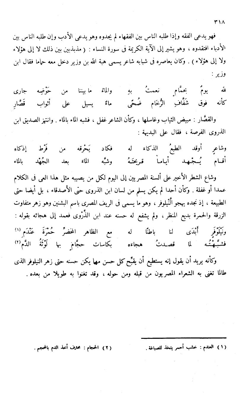 فهو يدعى الفقه وإذا طلبه الناس بين الفقهاء لم يجدوه وهو يدعى الأدب وإن طلبه الناس بين الأدباء افتقدوه، وهو يشير إلى الآية الكريمة فى سورة النساء: (مذبذبين بين ذلك لا إلى هؤلاء ولا إلى هؤلاء). وكان يعاصره فى شبابه شاعر يسمى هبة الله بن وزير دخل معه حماما فقال ابن وزير: