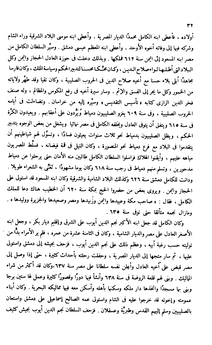 أولاده، فأعطى ابنه الكامل محمدا الديار المصرية، وأعطى ابنه موسى البلاد الشرقية وراء الشام وشركه فيها إلى وفاته أخوه الأوحد. وأعطى ابنه المعظم عيسى دمشق. وسيّر السلطان الكامل من مصر ابنه المسعود إلى اليمن سنة 612 فملكها. وبذلك دخلت فى حوزة العادل الحجاز واليمن وكل البلاد التى أظلها لواء صلاح الدين، وكان محنّكا محسنا لتدبير الحكم وسياسة الملك، وكان فارسا مجاهدا أبلى بلاء حسنا مع أخيه صلاح الدين فى الحروب الصليبية، وكان تقيا وقد طهّر ولاياته من الخمور وكل ما يجر إلى الفسق والإثم. وسار سيرة أخيه فى رفع المكوس والمظالم، وله صنف فخر الدين الرازى كتابه «تأسيس التقديس» وسيّره إليه من خراسان. وتضاءلت فى أيامه الحروب الصليبية، وفى سنة 609 يغزو الصليبيون دمياط ويرّدون على أعقابهم. ويعيدون الكرّة فى سنة 615 ويتفق أن يتوفى العادل ويخلفه الكامل فى مصر نهائيا ويشغل من بعض الوجوه بتدبير الحكم، ويظل الصليبيون بدمياط نحو ثلاث سنوات يعيثون فسادا، وتسوّل لهم شياطينهم أن يتقدموا فى البلاد مع فرع دمياط نحو المنصورة، وكان النيل فى قمة فيضانه، فسلّط المصريّون مياهه عليهم، وأيقنوا الهلاك فراسلوا السلطان الكامل طالبين منه الأمان حتى يرحلوا عن دمياط مدحورين، وتسلم منهم دمياط فى رجب سنة 618 وكان يوما مشهودا، تغنّى به الشعراء طويلا.