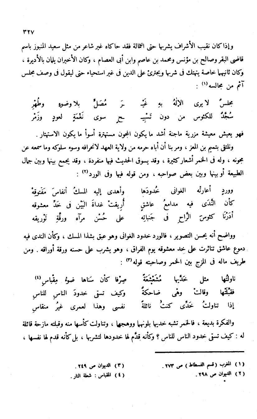 وواضح أنه يحسن التصوير، فالورد خدود الغوانى وهو عبق بشذا المسك، وكأن الندى فيه دموع عاشق تناثرت على خد معشوقه يوم الفراق، وهو يشرب على حسنه ورقة أوراقه. ومن طريف ماله فى المزج بين الخمر وصاحبته قوله (¬3):