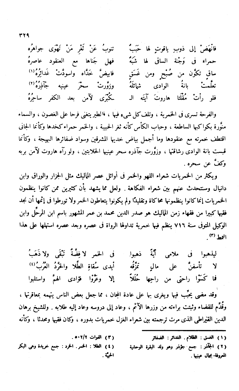 ويكثر من الخمريات شعراء اللهو والخمر فى أوائل عصر المماليك مثل الجزار والوراق وابن دانيال وسنتحدث عنهم بين شعراء الفكاهة. ولعل مما يشهد بأن كثيرين ممن كانوا ينظمون الخمريات إنما كانوا ينظمونها محاكاة وتقليدا ولم يكونوا يتعاطون الخمر ولا تورطوا فى إثمها أن نجد فقيها كبيرا من فقهاء زمن المماليك هو صدر الدين محمد بن عمر المشهور باسم ابن المرحّل وابن الوكيل المتوفى سنة 716 ينظم فيها خمرية تداولها الرواة فى عصره وبعد عصره استهلها على هذا النمط (¬3).