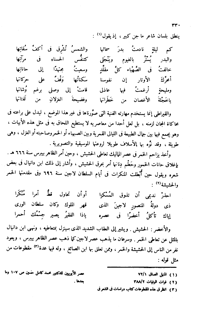 والأخضر: الحشيش. ويشير إلى العقاب الشديد الذى سينزل بمتعاطيه، ونهى ابن دانيال بالمثل عن تعاطى الخمر. وسرعان ما يذهب عصر لاجين كما ذهب عصر الظاهر بيبرس، ويعود نفر من الناس إلى الحشيشة والخمر، وممن تعلق بها ابن الصائغ، وله فيها عدة (¬3) مقطوعات من مثل قوله: