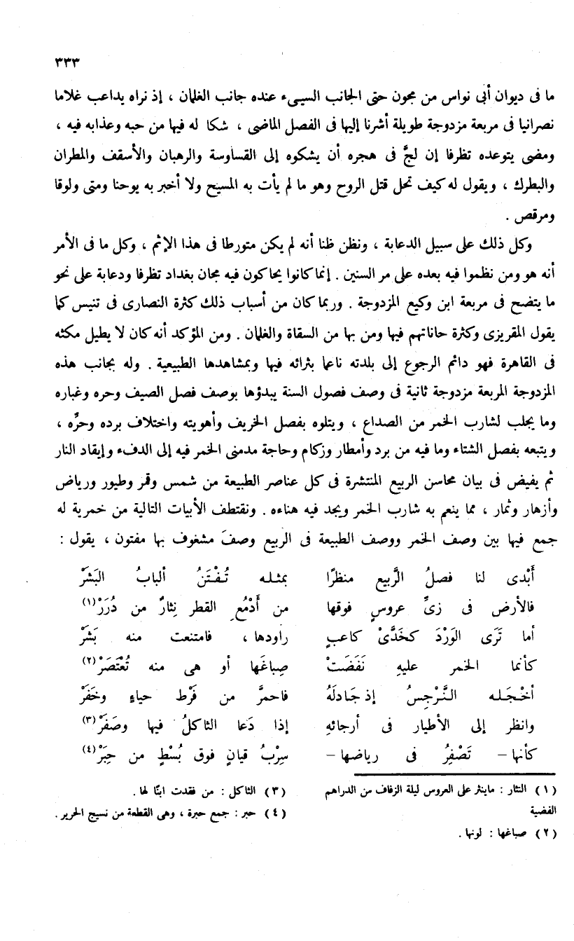 ما فى ديوان أبى نواس من مجون حتى الجانب السيئ عنده جانب الغلمان، إذ نراه يداعب غلاما نصرانيا فى مربعة مزدوجة طويلة أشرنا إليها فى الفصل الماضى، شكا له فيها من حبه وعذابه فيه، ومضى يتوعده تظرفا إن لجّ فى هجره أن يشكوه إلى القساوسة والرهبان والأسقف والمطران والبطرك، ويقول له كيف تحل قتل الروح وهو ما لم يأت به المسيح ولا أخبر به يوحنا ومتى ولوقا ومرقص.