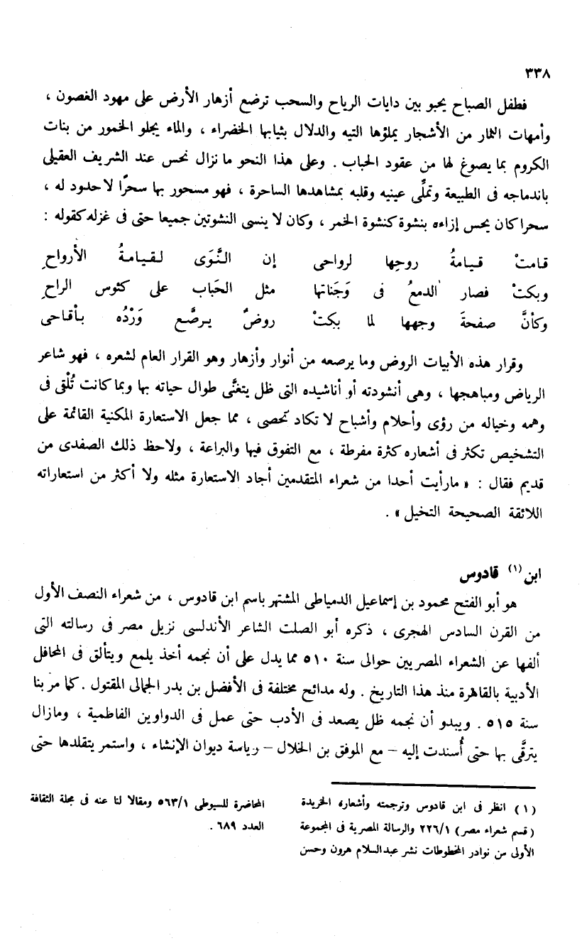 (¬1) انظر فى ابن قادوس وترجمته وأشعاره الخريدة (قسم شعراء مصر) 1/ 226 والرسالة المصرية فى المجموعة الأولى من نوادر المخطوطات نشر عبد السلام هرون وحسن المحاضرة للسيوطى 1/ 563 ومقالا لنا عنه فى مجلة الثقافة العدد 689.