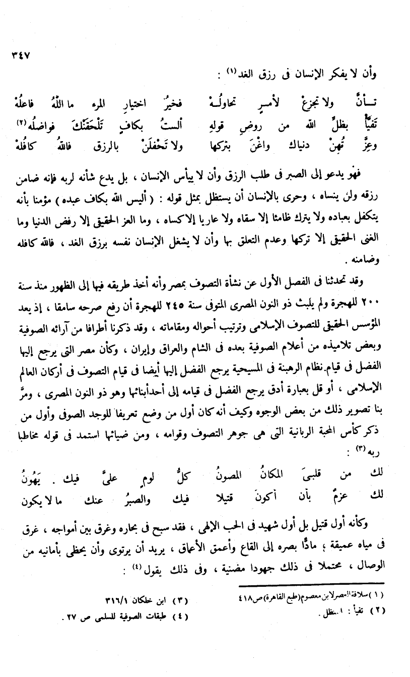 وقد تحدثنا فى الفصل الأول عن نشأة التصوف بمصر وأنه أخذ طريقه فيها إلى الظهور منذ سنة 200 للهجرة ولم يلبث ذو النون المصرى المتوفى سنة 245 للهجرة أن رفع صرحه سامقا، إذ يعد المؤسس الحقيقى للتصوف الإسلامى وترتيب أحواله ومقاماته، وقد ذكرنا أطرافا من آرائه الصوفية وبعض تلاميذه من أعلام الصوفية بعده فى الشام والعراق وإيران، وكأن مصر التى يرجع إليها الفضل فى قيام نظام الرهبنة فى المسيحية يرجع الفضل إليها أيضا فى قيام التصوف فى أركان العالم الإسلامى، أو قل بعبارة أدق يرجع الفضل فى قيامه إلى أحد أبنائها وهو ذو النون المصرى، ومرّ بنا تصوير ذلك من بعض الوجوه وكيف أنه كان أول من وضع تعريفا للوجد الصوفى وأول من ذكر كأس المحبة الربانية التى هى جوهر التصوف وقوامه، ومن ضيائها استمد فى قوله مخاطبا ربه (¬3):