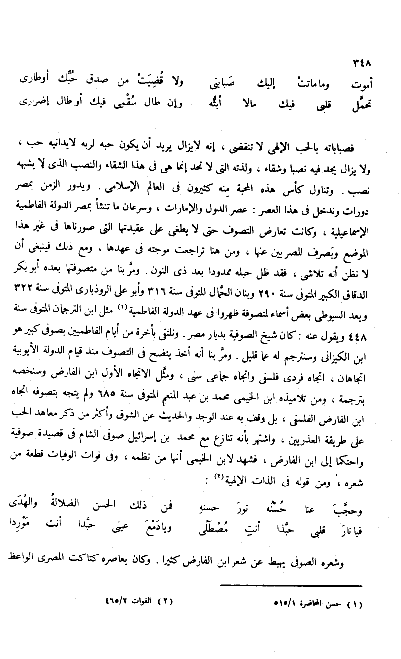 فصباباته بالحب الإلهى لا تنقضى، إنه لا يزال يريد أن يكون حبه لربه لا يدانيه حب، ولا يزال يجد فيه نصبا وشقاء، ولذته التى لا تحد إنما هى فى هذا الشقاء والنصب الذى لا يشبهه نصب. وتناول كأس هذه المحبة منه كثيرون فى العالم الإسلامى. ويدور الزمن بمصر دورات وندخل فى هذا العصر: عصر الدول والإمارات، وسرعان ما تنشأ بمصر الدولة الفاطمية الإسماعيلية، وكانت تعارض التصوف حتى لا يطفى على عقيدتها التى صورناها فى غير هذا الموضع وبصرف المصريين عنها، ومن هنا تراجعت موجته فى عهدها، ومع ذلك فينبغى أن لا نظن أنه تلاشى، فقد ظل حبله ممدودا بعد ذى النون. ومرّ بنا من متصوفتها بعده أبو بكر الدقاق الكبير المتوفى سنة 290 وبنان الحمّال المتوفى سنة 316 وأبو على الروذبارى المتوفى سنة 322 ويعد السيوطى بعض أسماء لمتصوفة ظهروا فى عهد الدولة الفاطمية (¬1) مثل ابن الترجمان المتوفى سنة 448 ويقول عنه: كان شيخ الصوفية بديار مصر. ونلتقى بأخرة من أيام الفاطميين بصوفى كبير هو ابن الكيزانى وسنترجم له عما قليل. ومرّ بنا أنه أخذ يتضح فى التصوف منذ قيام الدولة الأيوبية اتجاهان، اتجاه فردى فلسفى واتجاه جماعى سنى، ومثّل الاتجاه الأول ابن الفارض وسنخصه بترجمة، ومن تلاميذه ابن الخيمى محمد بن عبد المنعم المتوفى سنة 685 ولم يتجه بتصوفه اتجاه ابن الفارض الفلسفى، بل وقف به عند الوجد والحديث عن الشوق وأكثر من ذكر معاهد الحب على طريقة العذريين، واشتهر بأنه تنازع مع محمد بن إسرائيل صوفى الشام فى قصيدة صوفية واحتكما إلى ابن الفارض، فشهد لابن الخيمى أنها من نظمه، وفى فوات الوفيات قطعة من شعره، ومن قوله فى الذات الإلهية (¬2):