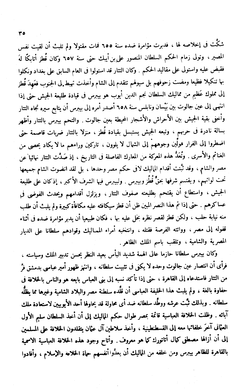 شكّت فى إخلاصه لها، فدبرت مؤامرة ضده سنة 655 فمات مقتولا ولم تلبث أن لقيت نفس المصير، وتولى زمام الحكم السلطان المنصور على بن أيبك حتى سنة 657 وكان قطز أتابكا له فقبض عليه واستولى على مقاليد الحكم. وكان التتار قد استولوا فى العام السابق على بغداد ونكلوا بها تنكيلا فظيعا ومضت زحوفهم بل سيولهم تتقدم إلى الشام وأخذت تهبط إلى الجنوب فعهد قطز إلى مملوك عظيم من مماليك السلطان نجم الدين أيوب هو بيبرس فى قيادة طليعة الجيش حتى إذا انتهى إلى عين جالوت بين بيسان ونابلس سنة 658 أصدر أمره إلى بيبرس أن يتابع سيره تجاه التتار وأخفى بقية الجيش بين الأحراش والأشجار المحيطة بعين جالوت. والتحم بيبرس بالتتار وأظهر بسالة نادرة فى حربهم، وتبعه الجيش يستبسل بقيادة قطز، منزلا بالتتار ضربات قاصمة حتى اضطروا إلى الفرار مولّين وجوههم إلى الشمال لا يلوون، تاركين وراءهم ما لا يكاد يحصى من الغنائم والأسرى. وتعدّ هذه المعركة من المعارك الفاصلة فى التاريخ، إذ صدّت التتار نهائيا عن مصر والشام، وقد ثبّتت أقدام المماليك لا فى حكم مصر وحدها، بل لقد انضوت الشام جميعها تحت لوائهم، ويقتسم شرفها بحقّ قطز وبيبرس. ولبيبرس فيها الشرف الأكبر، إذ كان على طليعة الجيش، واستطاع أن يقتحم بطليعته صفوف التتار، ويزلزل أقدامهم ويحدث الفوضى فى عساكرهم. حتى إذا تم هذا النصر المبين ظن أن قطز سيكافئه عليه مكافأة كبيرة ولم يلبث أن طلب منه نيابة حلب، ولكن قطز لقصر نظره بخل عليه بها، فكان طبيعيا أن يدبر مؤامرة ضده فى أثناء قفوله إلى مصر، وواتته الفرصة فقتله، وانتخبه أمراء المماليك وقوادهم سلطانا على الديار المصرية والشامية، وتلقب باسم الملك الظاهر.
