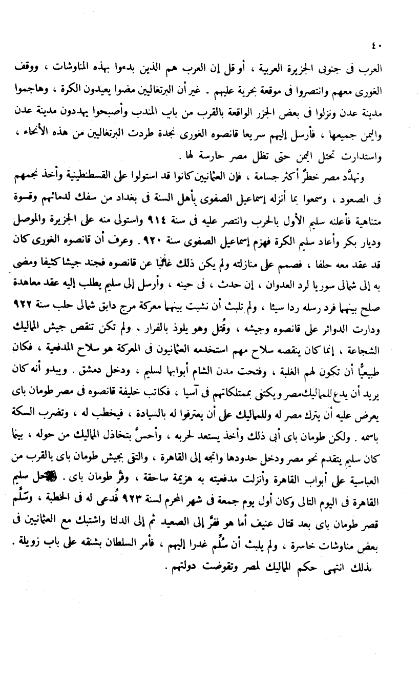 العرب فى جنوبى الجزيرة العربية، أو قل إن العرب هم الذين بدءوا بهذه المناوشات، ووقف الغورى معهم وانتصروا فى موقعة بحرية عليهم. غير أن البرتغاليين مضوا يعيدون الكرة، وهاجموا مدينة عدن ونزلوا فى بعض الجزر الواقعة بالقرب من باب المندب وأصبحوا يهددون مدينة عدن واليمن جميعها، فأرسل إليهم سريعا قانصوه الغورى نجدة طردت البرتغاليين من هذه الأنحاء، واستدارت تحتل اليمن حتى تظل مصر حارسة لها.
