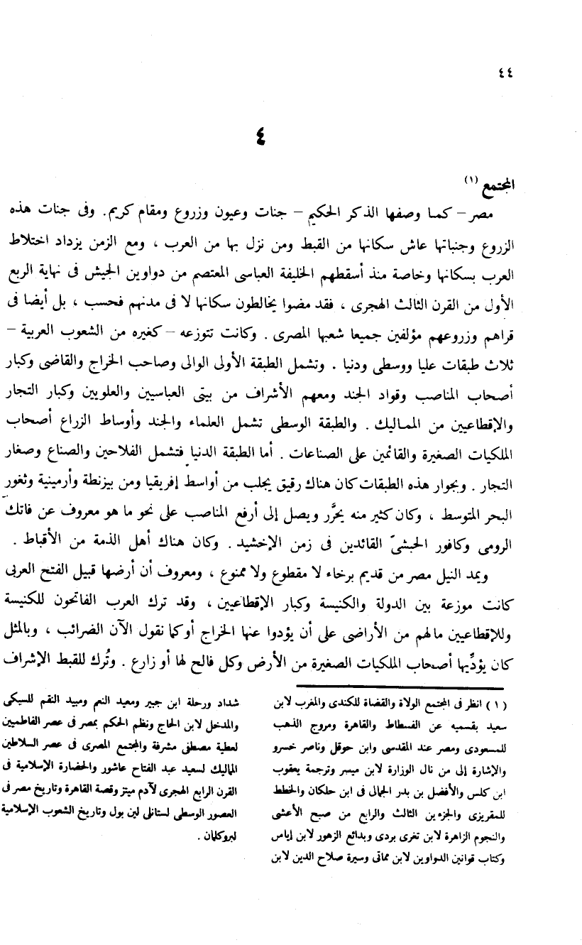 (¬1) انظر فى المجتمع الولاة والقضاة للكندى والمغرب لابن سعيد بقسميه عن الفسطاط والقاهرة ومروج الذهب للمسعودى ومصر عند المقدسى وابن حوقل وناصر خسرو والإشارة إلى من نال الوزارة لابن ميسر وترجمة يعقوب ابن كلس والأفضل بن بدر الجمالى فى ابن حلكان والخطط للمقريزى والجزءين الثالث والرابع من صبح الأعشى والنجوم الزاهرة لابن تغرى بردى وبدائع الزهور لابن إياس وكتاب قوانين الدواوين لابن مماتى وسيرة صلاح الدين لابن شداد ورحلة ابن جبير ومعيد النعم ومبيد النقم للسيكى والمدخل لابن الحاج ونظم الحكم بمصر فى عصر الفاطميين لعطية مصطفى مشرفة والمجتمع المصرى فى عصر السلاطين المماليك لسعيد عبد الفتاح عاشور والحضارة الإسلامية فى القرن الرابع الهجرى لآدم ميتز وقصة القاهرة وتاريخ مصر فى العصور الوسطى لستانلى لين بول وتاريخ الشعوب الإسلامية لبروكلمان.