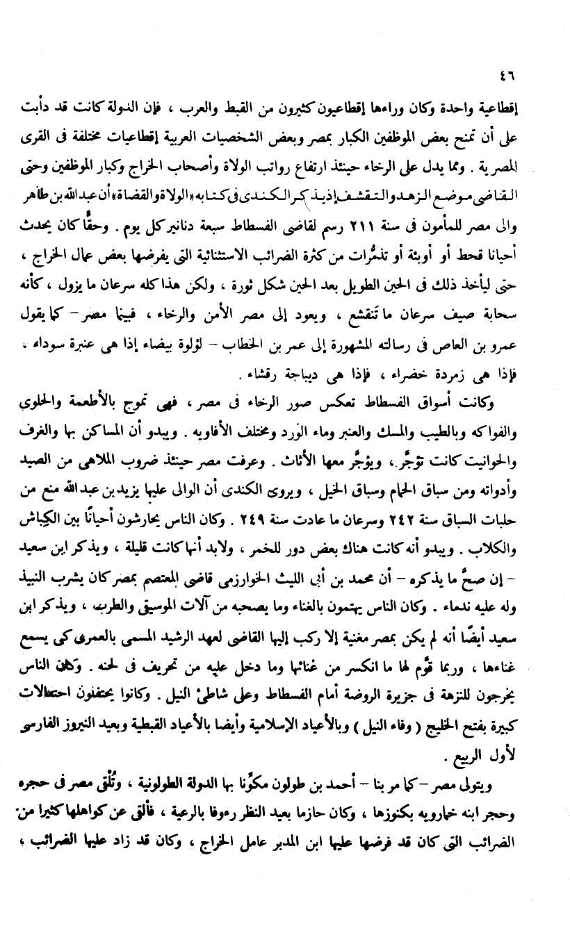 إقطاعية واحدة وكان وراءها إقطاعيون كثيرون من القبط والعرب، فإن الدولة كانت قد دأبت على أن تمنح بعض الموظفين الكبار بمصر وبعض الشخصيات العربية إقطاعيات مختلفة فى القرى المصرية. ومما يدل على الرخاء حينئذ ارتفاع رواتب الولاة وأصحاب الخراج وكبار الموظفين وحتى القاضى موضع الزهد والتقشف إذ يذكر الكندى فى كتابه «الولاة والقضاة» أن عبد الله بن طاهر والى مصر للمأمون فى سنة 211 رسم لقاضى الفسطاط سبعة دنانير كل يوم. وحقّا كان يحدث أحيانا قحط أو أوبئة أو تذمّرات من كثرة الضرائب الاستثنائية التى يفرضها بعض عمال الخراج، حتى ليأخذ ذلك فى الحين الطويل بعد الحين شكل ثورة، ولكن هذا كله سرعان ما يزول، كأنه سحابة صيف سرعان ما تنقشع، ويعود إلى مصر الأمن والرخاء، فبينما مصر-كما يقول عمرو بن العاص فى رسالته المشهورة إلى عمر بن الخطاب-لؤلوة بيضاء إذا هى عنبرة سوداء.