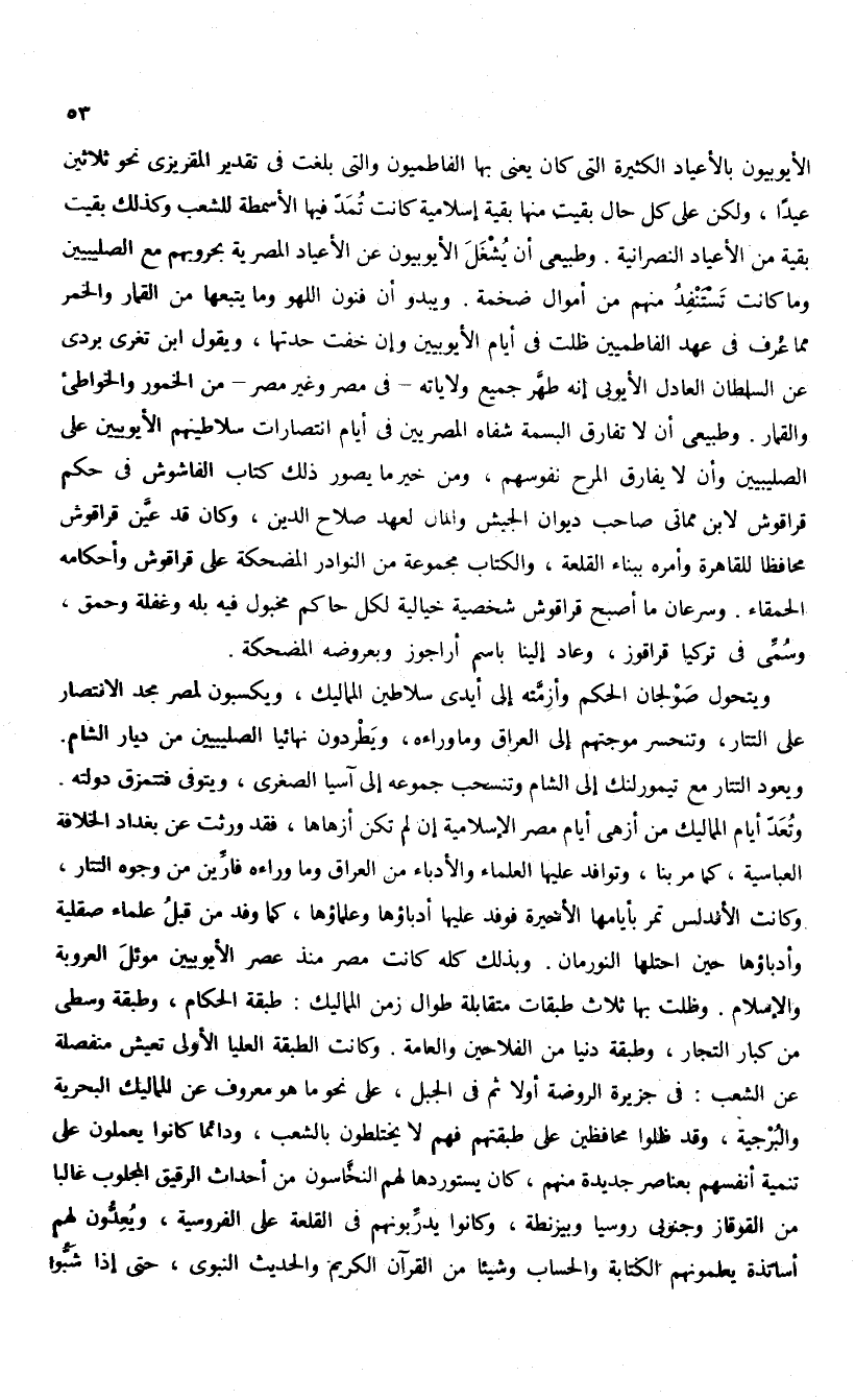 وتعدّ أيام المماليك من أزهى أيام مصر الإسلامية إن لم تكن أزهاها، فقد ورثت عن بغداد الخلافة العباسية، كما مر بنا، وتوافد عليها العلماء والأدباء من العراق وما وراءه فارّين من وجوه التتار، وكانت الأندلس تمر بأيامها الأخيرة فوفد عليها أدباؤها وعلماؤها، كما وفد من قبل علماء صقلية وأدباؤها حين احتلها النورمان. وبذلك كله كانت مصر منذ عصر الأيوبيين موئل العروبة والإسلام. وظلت بها ثلاث طبقات متقابلة طوال زمن المماليك: طبقة الحكام، وطبقة وسطى من كبار التجار، وطبقة دنيا من الفلاحين والعامة. وكانت الطبقة العليا الأولى تعيش منفصلة عن الشعب: فى جزيرة الروضة أولا ثم فى الجبل، على نحو ما هو معروف عن المماليك البحرية والبرجية، وقد ظلوا محافظين على طبقتهم فهم لا يختلطون بالشعب، ودائما كانوا يعملون على تنمية أنفسهم بعناصر جديدة منهم، كان يستوردها لهم النخّاسون من أحداث الرقيق المجلوب غالبا من القوقاز وجنوبى روسيا وبيزنطة، وكانوا يدرّبونهم فى القلعة على الفروسية، ويعدّون لهم أساتذة يعلمونهم الكتابة والحساب وشيئا من القرآن الكريم والحديث النبوى، حتى إذا شبّوا