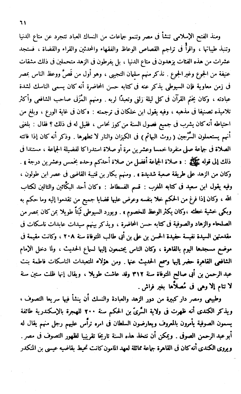 وكان من الزهد على طريقة صعبة شديدة». ومنهم بكار بن قتيبة القاضى فى عصر ابن طولون، وفيه يقول ابن سعيد فى كتابه المغرب: قسم الفسطاط: «كان أحد البكّائين والتالين لكتاب الله، وكان إذا فرغ من الحكم خلا بنفسه وعرض عليها قضايا جميع من تقدموا إليه وما حكم به وبكى خشية خطئه، وكان يكثر الوعظ للخصوم». ويورد السيوطى ثبتا طويلا بمن كان بمصر من الصلحاء والزهاد والصوفية فى كتابه حسن المحاضرة، ويذكر بينهم سيدات عابدات ناسكات فى مقدمتهن السيدة نفيسة حفيدة الحسن بن على بن أبى طالب المتوفاة سنة 208، وكانت مقيمة فى موضع مسجدها اليوم بالقاهرة، وكان الناس يجتمعون إليها لسماع الحديث، ولما دخل الإمام الشافعى القاهرة حضر إليها وسمع الحديث عنها. ومن هؤلاء المتعبدات الناسكات فاطمة بنت عبد الرحمن بن أبى صالح المتوفاة سنة 312 وقد عاشت طويلا، ويقال إنها ظلت ستين سنة لا تنام إلا وهى فى مصلاّها بغير فراش.