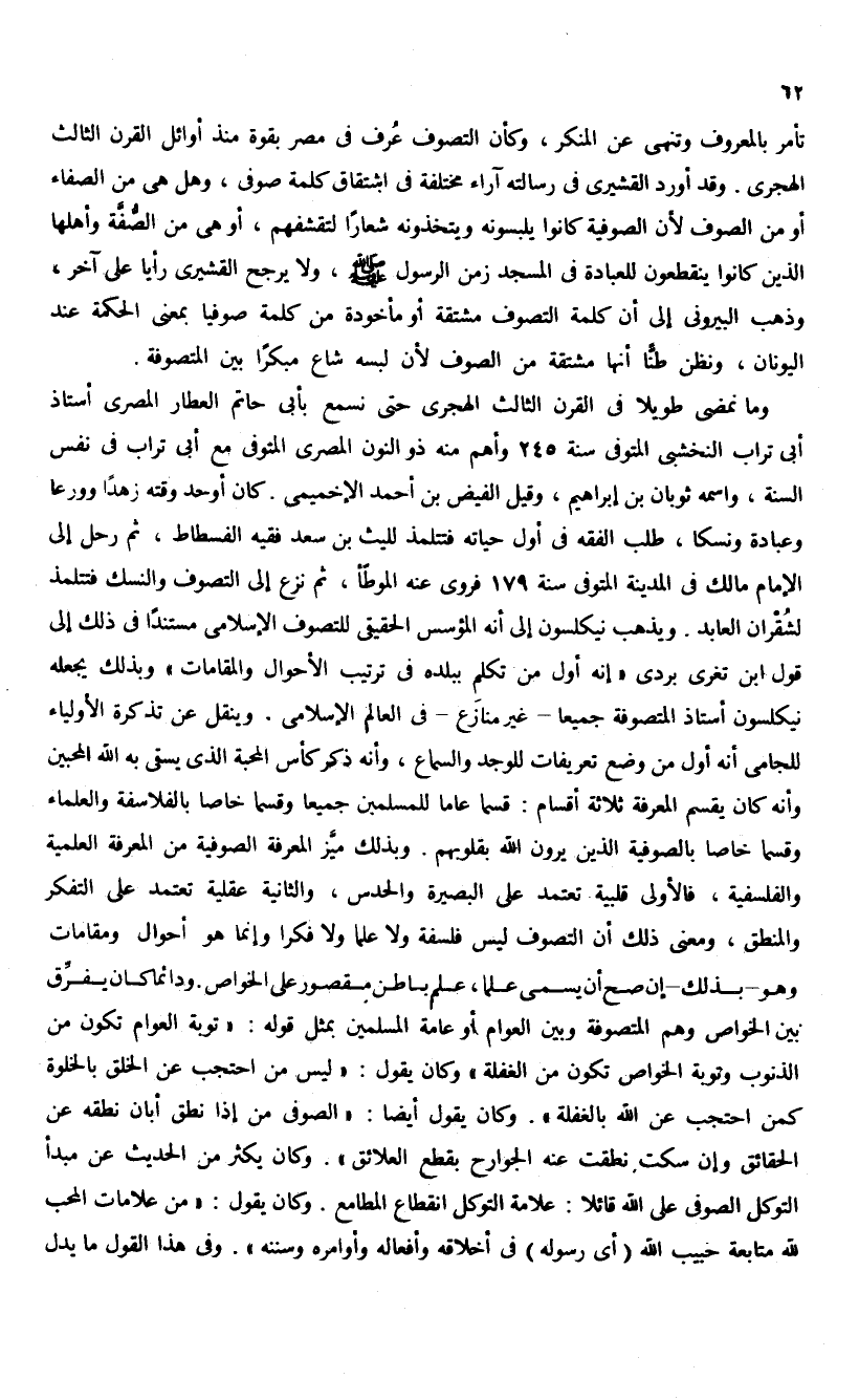 تأمر بالمعروف وتنهى عن المنكر، وكأن التصوف عرف فى مصر بقوة منذ أوائل القرن الثالث الهجرى. وقد أورد القشيرى فى رسالته آراء مختلفة فى اشتقاق كلمة صوفى، وهل هى من الصفاء أو من الصوف لأن الصوفية كانوا يلبسونه ويتخذونه شعارا لتقشفهم، أو هى من الصّفّة وأهلها الذين كانوا ينقطعون للعبادة فى المسجد زمن الرسول صلّى الله عليه وسلم، ولا يرجح القشيرى رأيا على آخر، وذهب البيرونى إلى أن كلمة التصوف مشتقة أو مأخوذة من كلمة صوفيا بمعنى الحكمة عند اليونان، ونظن ظنّا أنها مشتقة من الصوف لأن لبسه شاع مبكرا بين المتصوفة.
