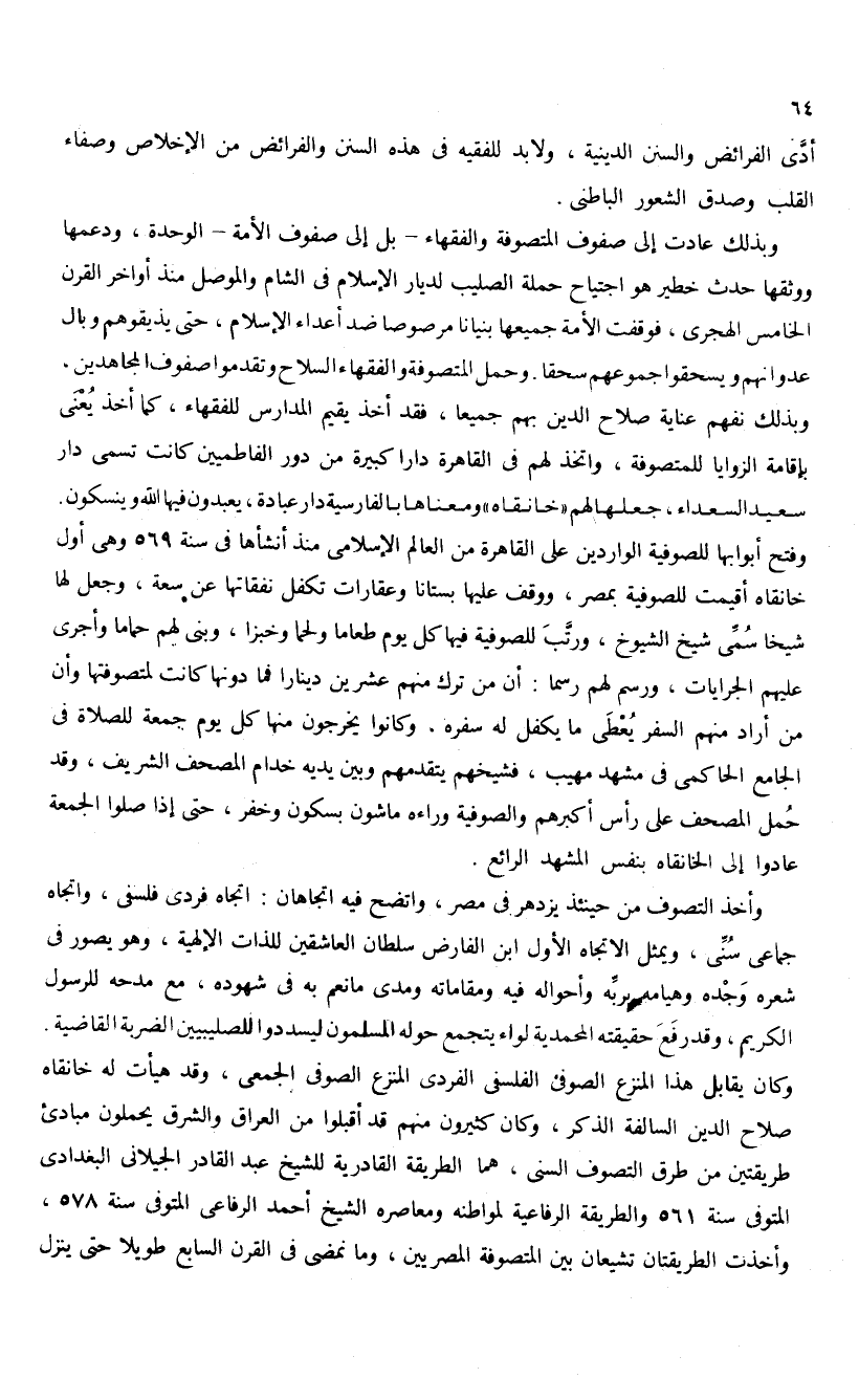 وكان يقابل هذا المنزع الصوفى الفلسفى الفردى المنزع الصوفى الجمعى، وقد هيأت له خانقاه صلاح الدين السالفة الذكر، وكان كثيرون منهم قد أقبلوا من العراق والشرق يحملون مبادئ طريقتين من طرق التصوف السنى، هما الطريقة القادرية للشيخ عبد القادر الجيلانى البغدادى المتوفى سنة 561 والطريقة الرفاعية لمواطنه ومعاصره الشيخ أحمد الرفاعى المتوفى سنة 578، وأخذت الطريقتان تشيعان بين المتصوفة المصريين، وما نمضى فى القرن السابع طويلا حتى ينزل