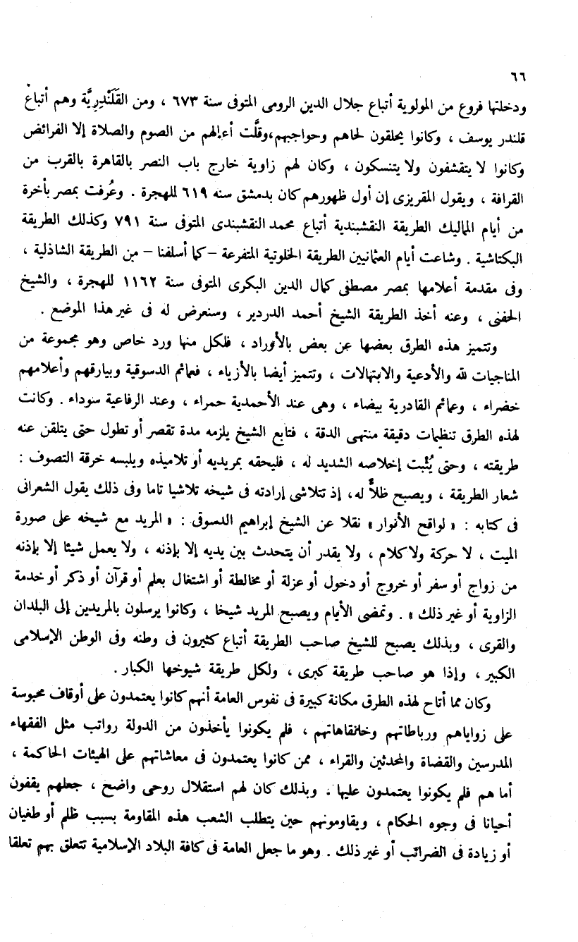 ودخلتها فروع من المولوية أتباع جلال الدين الرومى المتوفى سنة 673، ومن القلندريّة وهم أتباع قلندر يوسف، وكانوا يحلقون لحاهم وحواجبهم، وقلّت أعمالهم من الصوم والصلاة إلا الفرائض وكانوا لا يتقشفون ولا يتنسكون، وكان لهم زاوية خارج باب النصر بالقاهرة بالقرب من القرافة، ويقول المقريزى إن أول ظهورهم كان بدمشق سنة 619 للهجرة. وعرفت بمصر بأخرة من أيام المماليك الطريقة النقشبندية أتباع محمد النقشبندى المتوفى سنة 791 وكذلك الطريقة البكتاشية. وشاعت أيام العثمانيين الطريقة الخلوتية المتفرعة-كما أسلفنا-من الطريقة الشاذلية، وفى مقدمة أعلامها بمصر مصطفى كمال الدين البكرى المتوفى سنة 1162 للهجرة، والشيخ الحفنى، وعنه أخذ الطريقة الشيخ أحمد الدردير، وسنعرض له فى غير هذا الموضع.