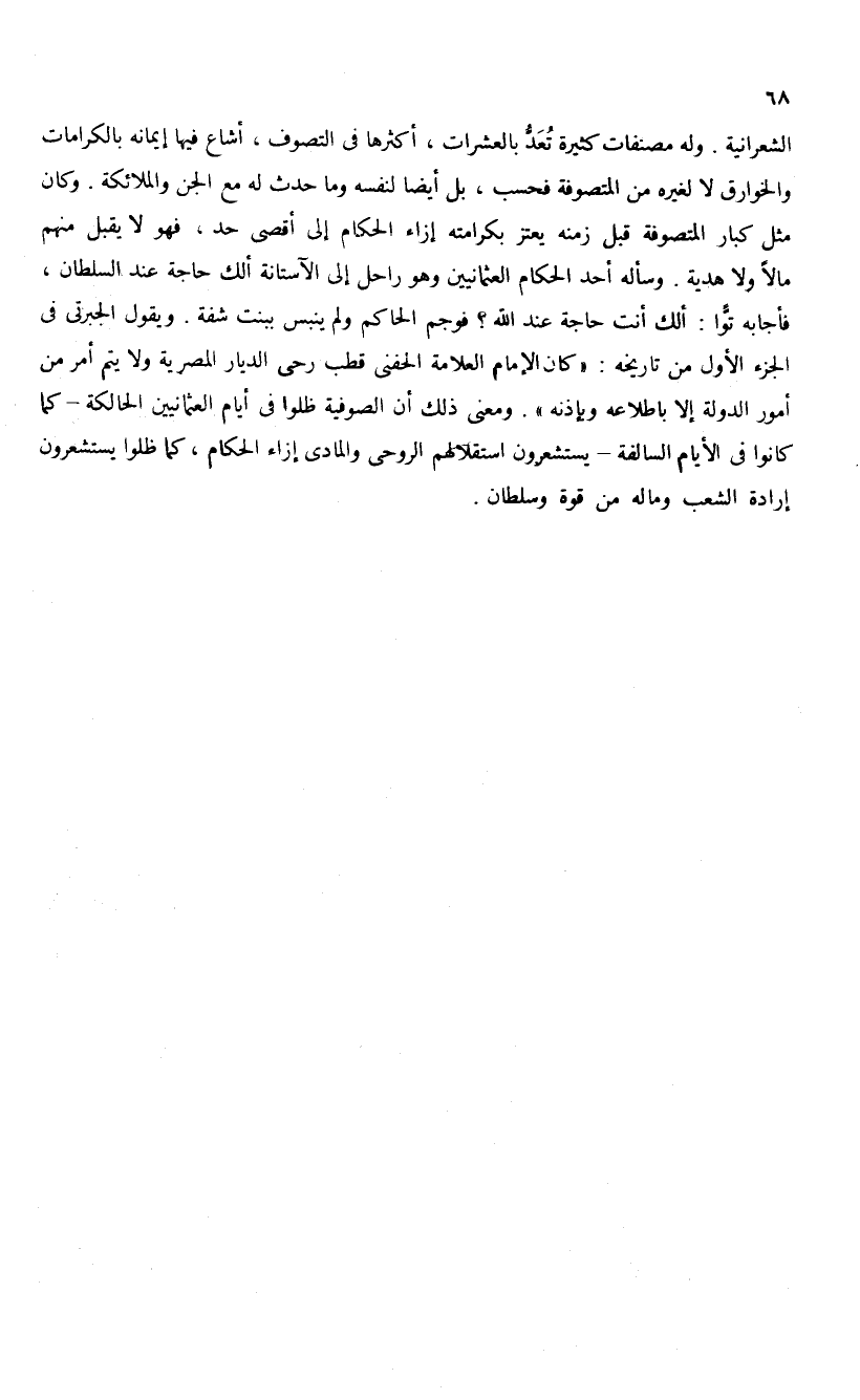 الشعرانية. وله مصنفات كثيرة تعدّ بالعشرات، أكثرها فى التصوف، أشاع فيها إيمانه بالكرامات والخوارق لا لغيره من المتصوفة فحسب، بل أيضا لنفسه وما حدث له مع الجن والملائكة. وكان مثل كبار المتصوفة قبل زمنه يعتز بكرامته إزاء الحكام إلى أقصى حد، فهو لا يقبل منهم مالا ولا هدية. وسأله أحد الحكام العثمانيين وهو راحل إلى الآستانة ألك حاجة عند السلطان، فأجابه توّا: ألك أنت حاجة عند الله؟ فوجم الحاكم ولم ينبس ببنت شفة. ويقول الجبرتى فى الجزء الأول من تاريخه: «كان الإمام العلامة الحفنى قطب رحى الديار المصرية ولا يتم أمر من أمور الدولة إلا باطلاعه وبإذنه». ومعنى ذلك أن الصوفية ظلوا فى أيام العثمانيين الحالكة-كما كانوا فى الأيام السالفة-يستشعرون استقلالهم الروحى والمادى إزاء الحكام، كما ظلوا يستشعرون إرادة الشعب وماله من قوة وسلطان.