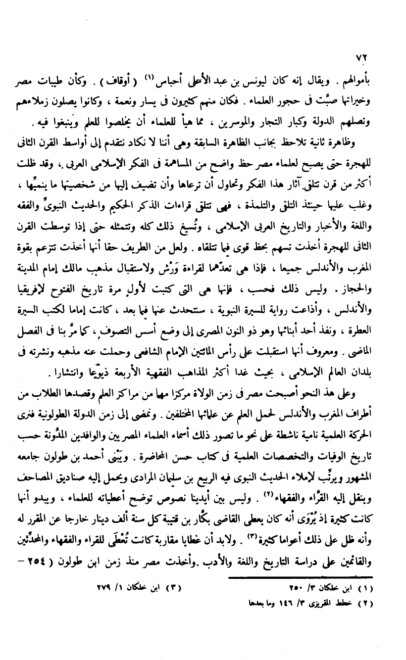 وعلى هذا النحو أصبحت مصر فى زمن الولاة مركزا مهما من مراكز العلم وقصدها الطلاب من أطراف المغرب والأندلس لحمل العلم عن علمائها المختلفين. ونمضى إلى زمن الدولة الطولونية فنرى الحركة العلمية نامية ناشطة على نحو ما تصور ذلك أسماء العلماء المصريين والوافدين المدّونة حسب تاريخ الوفيات والتخصصات العلمية فى كتاب حسن المحاضرة. ويبنى أحمد بن طولون جامعه المشهور ويرتّب لإملاء الحديث النبوى فيه الربيع بن سليمان المرادى ويحمل إليه صناديق المصاحف وينقل إليه القرّاء والفقهاء (¬2). وليس بين أيدينا نصوص توضح أعطياته للعلماء، ويبدو أنها كانت كثيرة إذ يروى أنه كان يعطى القاضى بكّار بن قتيبة كل سنة ألف دينار خارجا عن المقرر له وأنه ظل على ذلك أعواما كثيرة (¬3). ولا بد أن عطايا مقاربة كانت تعطى للقراء والفقهاء والمحدّثين والقائمين على دراسة التاريخ واللغة والأدب. وأخذت مصر منذ زمن ابن طولون (254 -