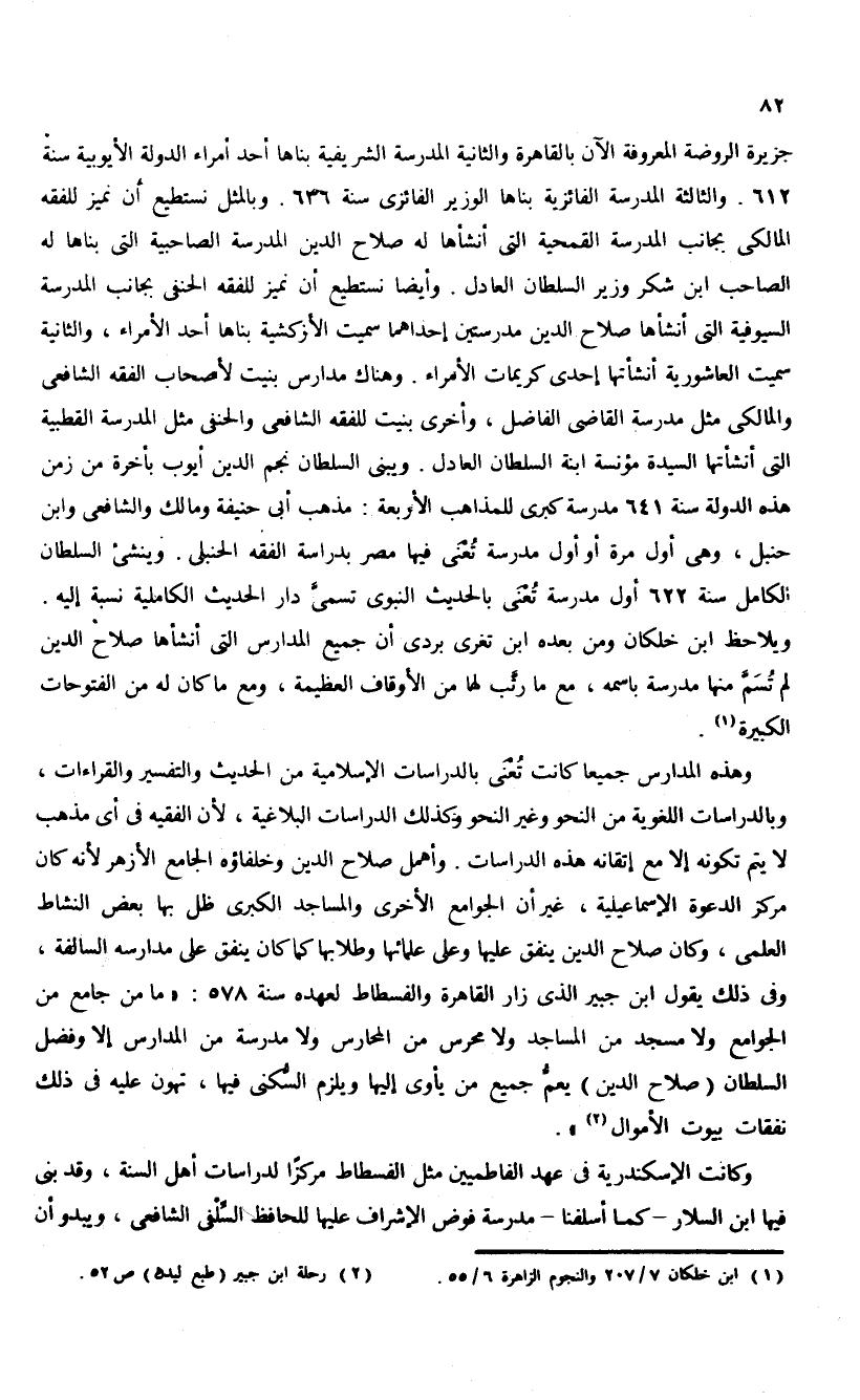 وهذه المدارس جميعا كانت تعنى بالدراسات الإسلامية من الحديث والتفسير والقراءات، وبالدراسات اللغوية من النحو وغير النحو وكذلك الدراسات البلاغية، لأن الفقيه فى أى مذهب لا يتم تكونه إلا مع إتقانه هذه الدراسات. وأهمل صلاح الدين وخلفاؤه الجامع الأزهر لأنه كان مركز الدعوة الإسماعيلية، غير أن الجوامع الأخرى والمساجد الكبرى ظل بها بعض النشاط العلمى، وكان صلاح الدين ينفق عليها وعلى علمائها وطلابها كما كان ينفق على مدارسه السالفة، وفى ذلك يقول ابن جبير الذى زار القاهرة والفسطاط لعهده سنة 578: «ما من جامع من الجوامع ولا مسجد من المساجد ولا محرس من المحارس ولا مدرسة من المدارس إلا وفضل السلطان (صلاح الدين) يعمّ جميع من يأوى إليها ويلزم السّكنى فيها، تهون عليه فى ذلك نفقات بيوت الأموال (¬2)».