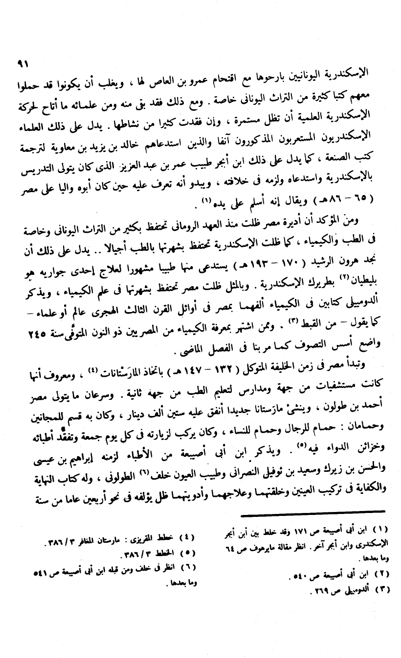 ومن المؤكد أن أديرة مصر ظلت منذ العهد الرومانى تحتفظ بكثير من التراث اليونانى وخاصة فى الطب والكيمياء، كما ظلت الإسكندرية تحتفظ بشهرتها بالطب أجيالا. . يدل على ذلك أن نجد هرون الرشيد (170 - 193 هـ) يستدعى منها طبيبا مشهورا لعلاج إحدى جواريه هو بليطيان (¬2) بطريرك الإسكندرية. وبالمثل ظلت مصر تحتفظ بشهرتها فى علم الكيمياء، ويذكر ألدومييلى كتابين فى الكيمياء ألفهما بمصر فى أوائل القرن الثالث الهجرى عالم أو علماء- كما يقول-من القبط (¬3)، وممن اشتهر بمعرفة الكيمياء من المصريين ذو النون المتوفّى سنة 245 واضع أسس التصوف كما مر بنا فى الفصل الماضى.