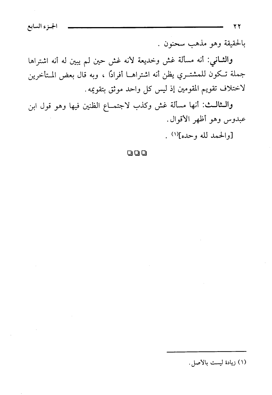 والثاني: أنه مسألة غش وخديعة لأنه غش حين لم يبين له أنه اشتراها جملة تكون للمشتري يظن أنه اشتراها أفرادًا، وبه قال بعض المتأخرين لاختلاف تقويم المقومين إذ ليس كل واحد موثق بتقويمه.