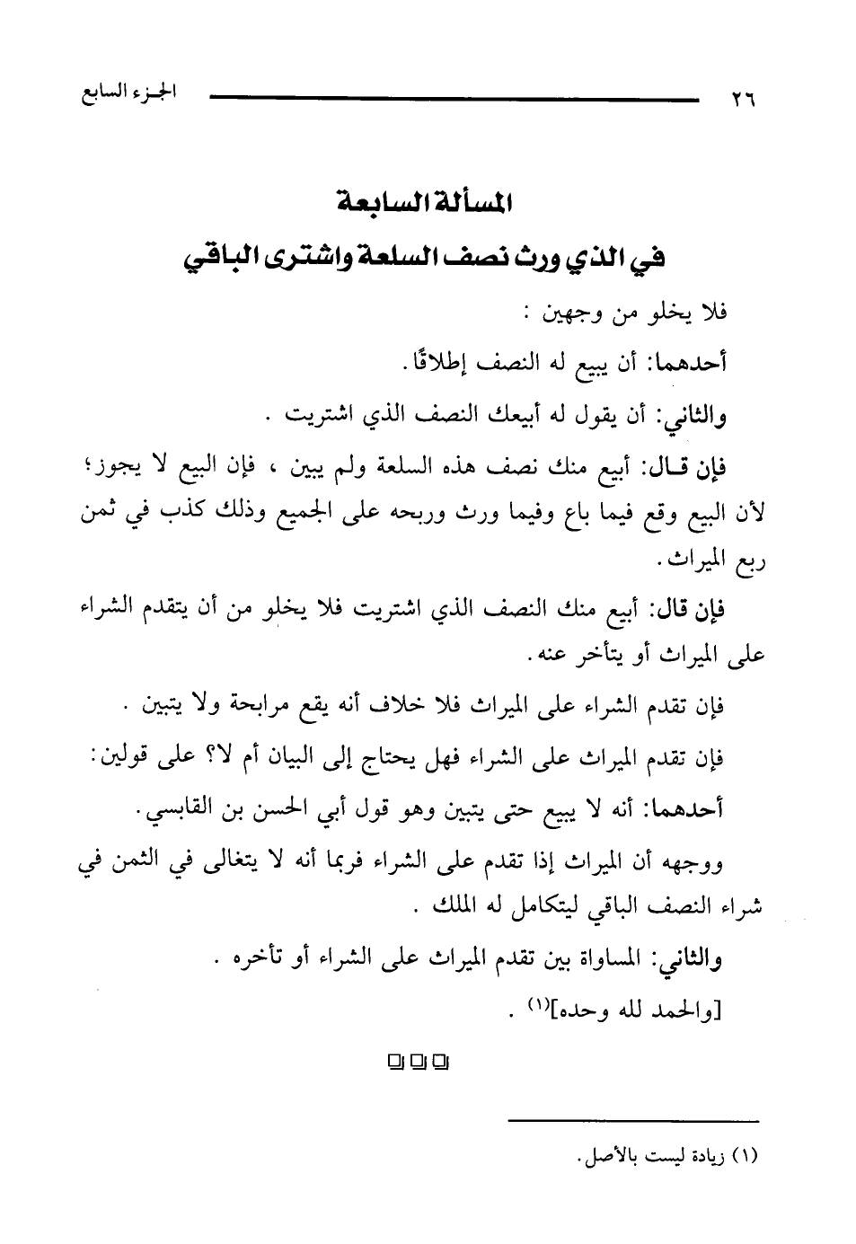 المسألة السابعة في الذي ورث نصف السلعة واشترى الباقي