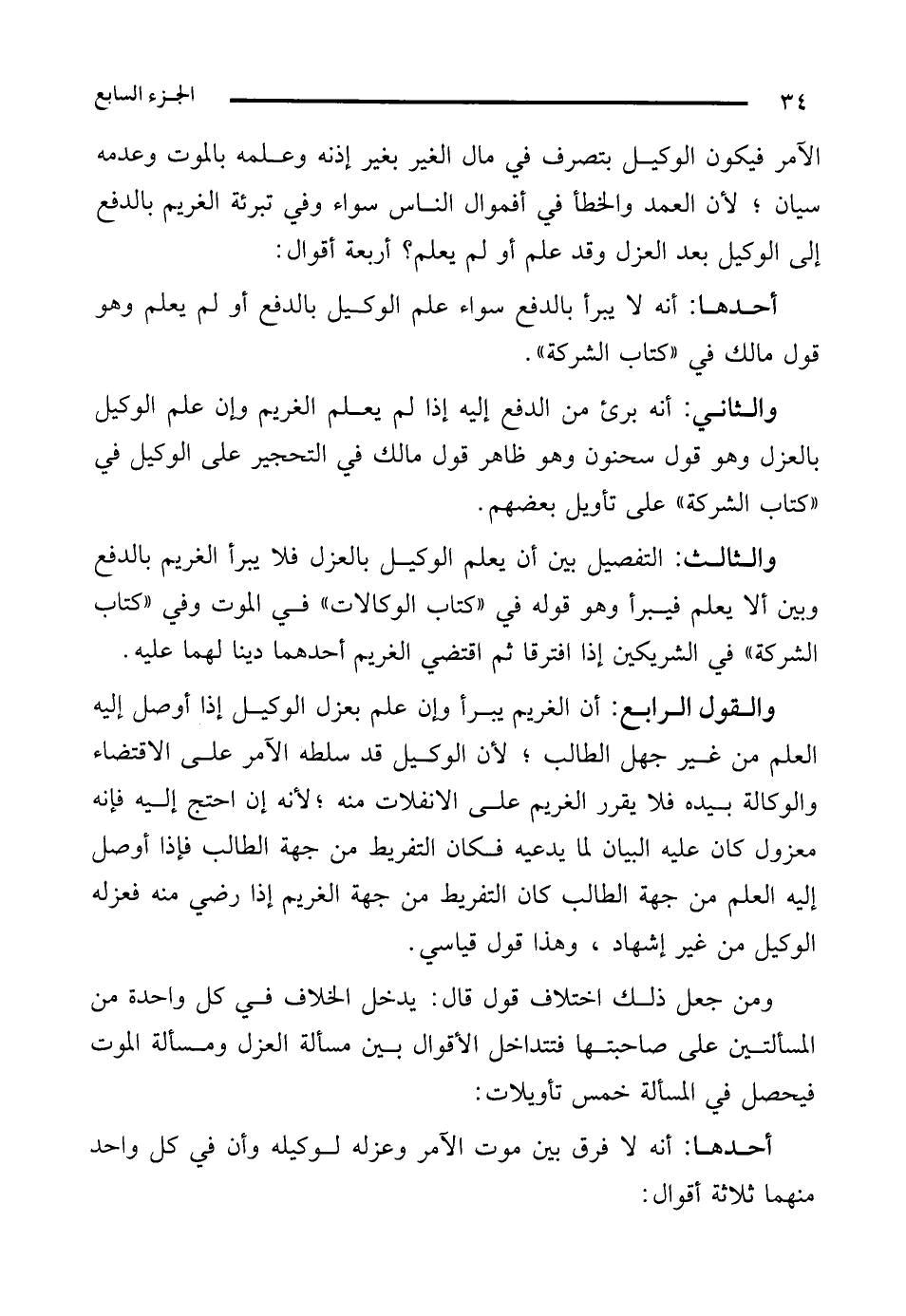 والقول الرابع: أن الغريم يبرأ وإن علم بعزل الوكيل إذا أوصل إليه العلم من غير جهل الطالب؛ لأن الوكيل قد سلطه الآمر على الاقتضاء والوكالة بيده فلا يقرر الغريم على الانفلات منه؛ لأنه إن احتج إليه فإنه معزول كان عليه البيان لا يدعيه فكان التفريط من جهة الطالب فإذا أوصل إليه العلم من جهة الطالب كان التفريط من جهة الغريم إذا رضي منه فعزله الوكيل من غير إشهاد، وهذا قول قياسي.
