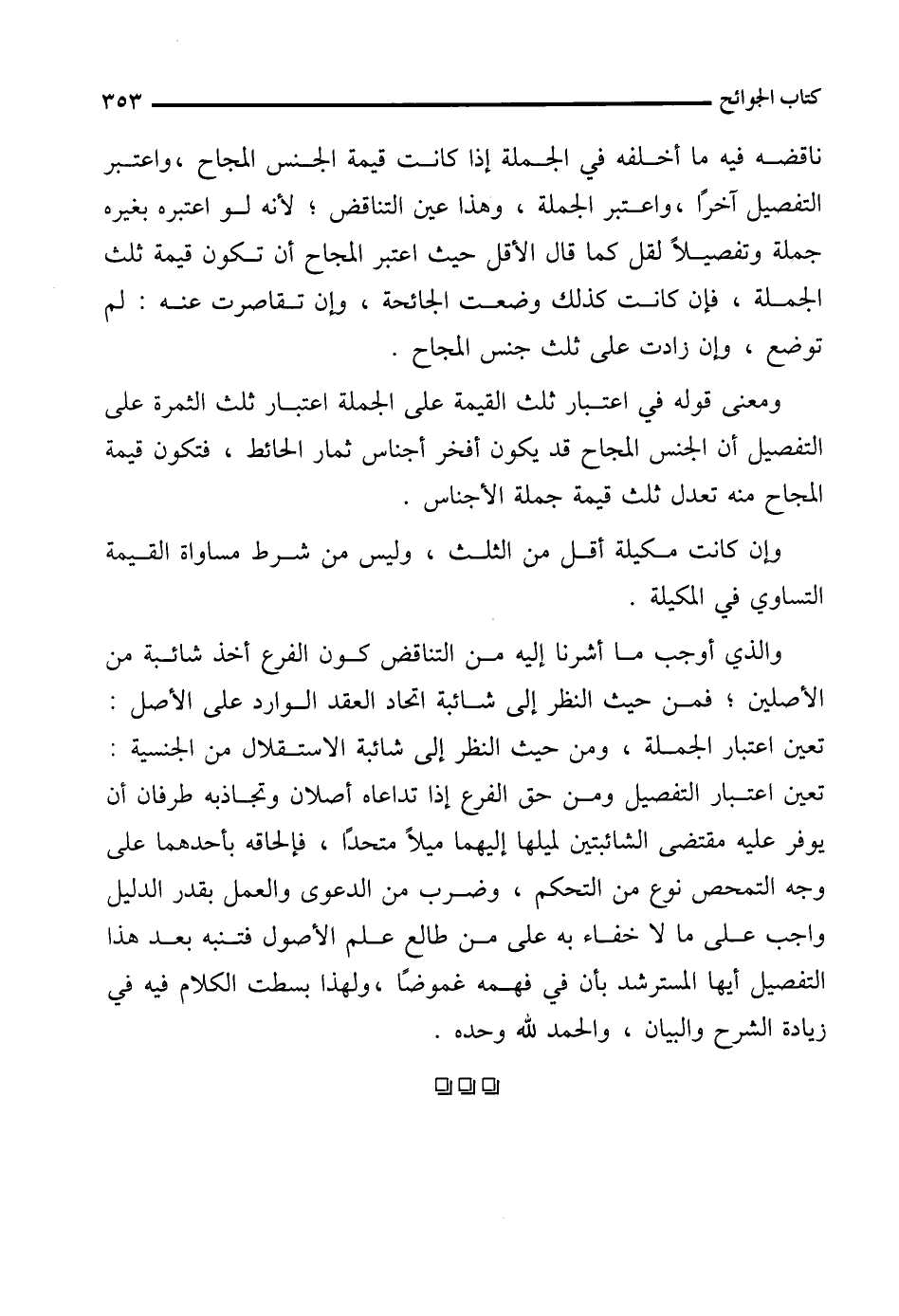 والذي أوجب ما أشرنا إليه من التناقض كون الفرع أخذ شائبة من الأصلين؛ فمن حيث النظر إلى شائبة اتحاد العقد الوارد على الأصل: تعين اعتبار الجملة، ومن حيث النظر إلى شائبة الاستقلال من الجنسية: تعين اعتبار التفصيل ومن حق الفرع إذا تداعاه أصلان وتجاذبه طرفان أن يوفر عليه مقتضى الشائبتين لميلها إليهما ميلًا متحدًا، فإلحاقه بأحدهما على وجه التمحص نوع من التحكم، وضرب من الدعوى والعمل بقدر الدليل واجب على ما لا خفاء به على من طالع علم الأصول فتنبه بعد هذا التفصيل أيها المسترشد بأن في فهمه غموضًا، ولهذا بسطت الكلام فيه في زيادة الشرح والبيان، والحمد لله وحده.