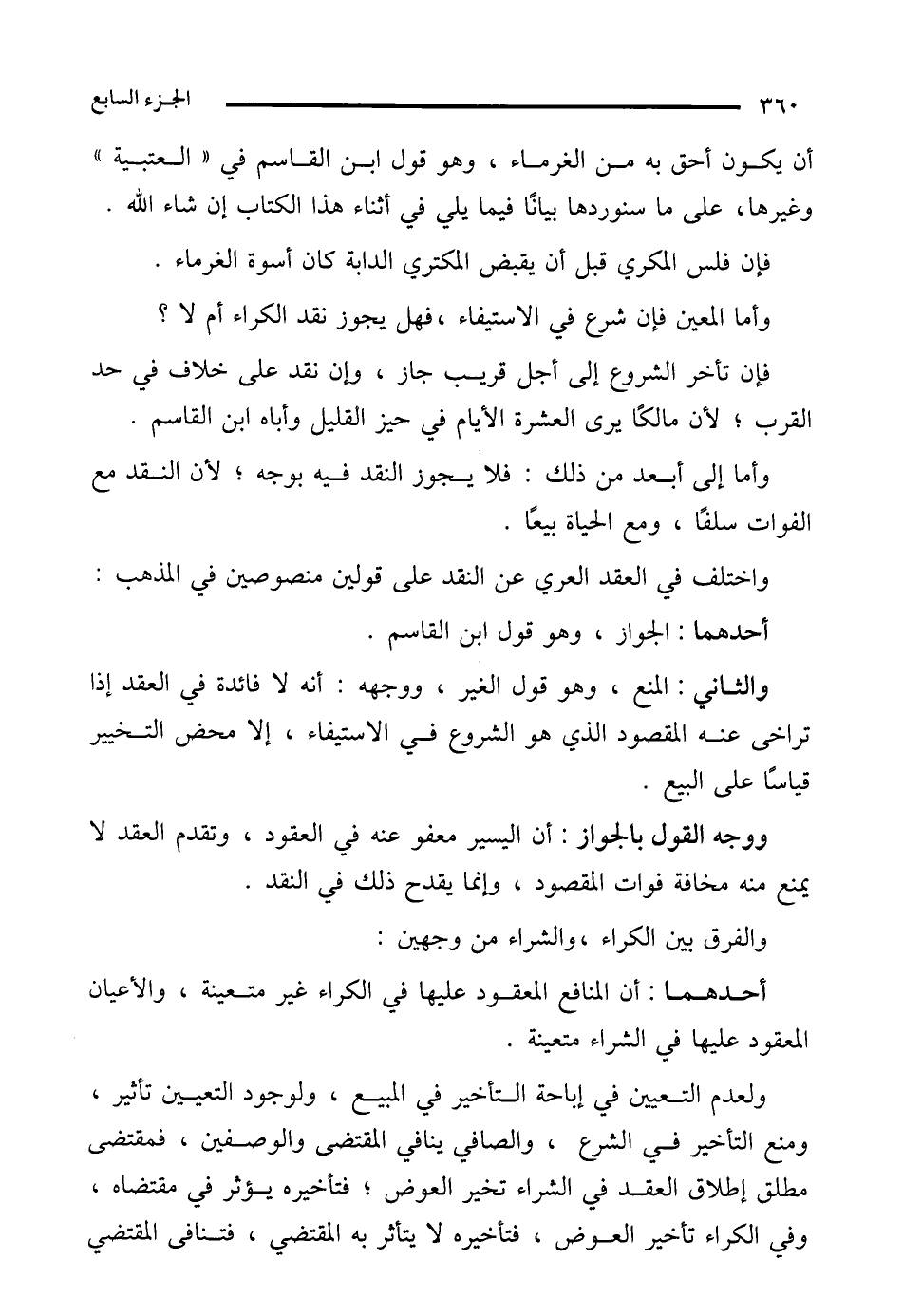 ولعدم التعيين في إباحة التأخير في المبيع، ولوجود التعيين تأثير، ومنع التأخير في الشرع، والصافي ينافي المقتضى والوصفين، فمقتضى مطلق إطلاق العقد في الشراء تخير العوض؛ فتأخيره يؤثر في مقتضاه، وفي الكراء تأخير العوض، فتأخيره لا يتأثر به المقتضي، فتنافى المقتضي