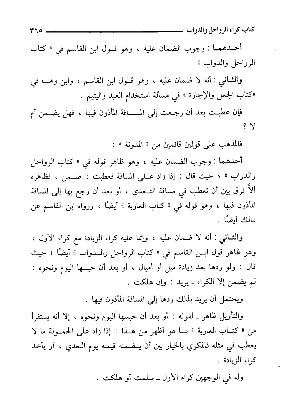 والثاني: أنه لا ضمان عليه، وإنما عليه كراء الزيادة مع كراء الأول، وهو ظاهر قول ابن القاسم في "كتاب الرواحل والدواب" أيضًا؛ حيث قال: ولو ردها بعد زيادة ميل أو أميال، أو بعد أن حبسها اليوم ونحوه: لم يضمن إلا الكراء -يريد: وإن هلكت.