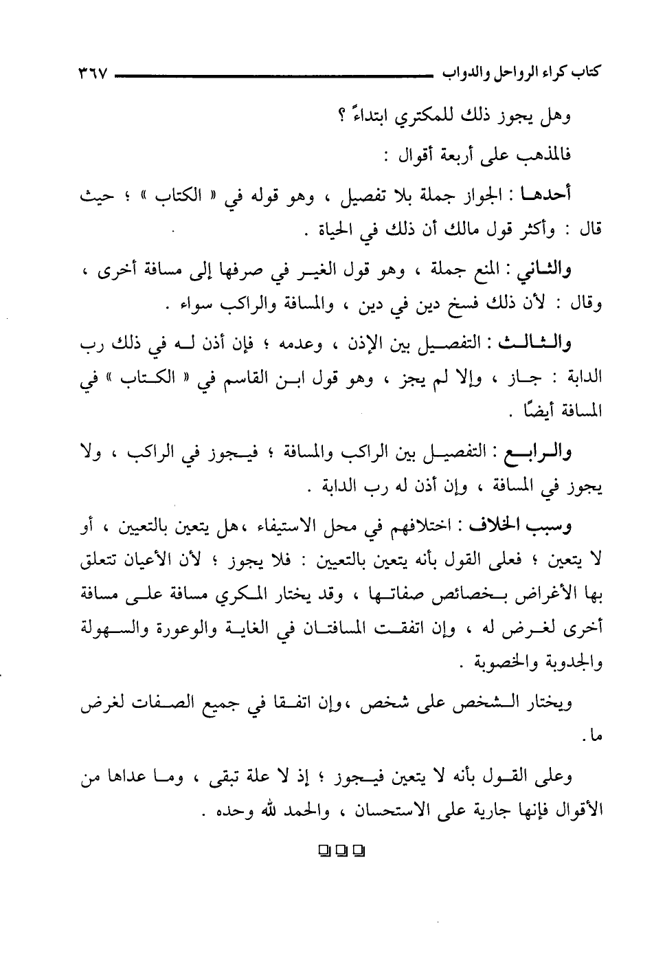 والرابع: التفصيل بين الراكب والمسافة؛ فيجوز في الراكب، ولا يجوز في المسافة، وإن أذن له رب الدابة.