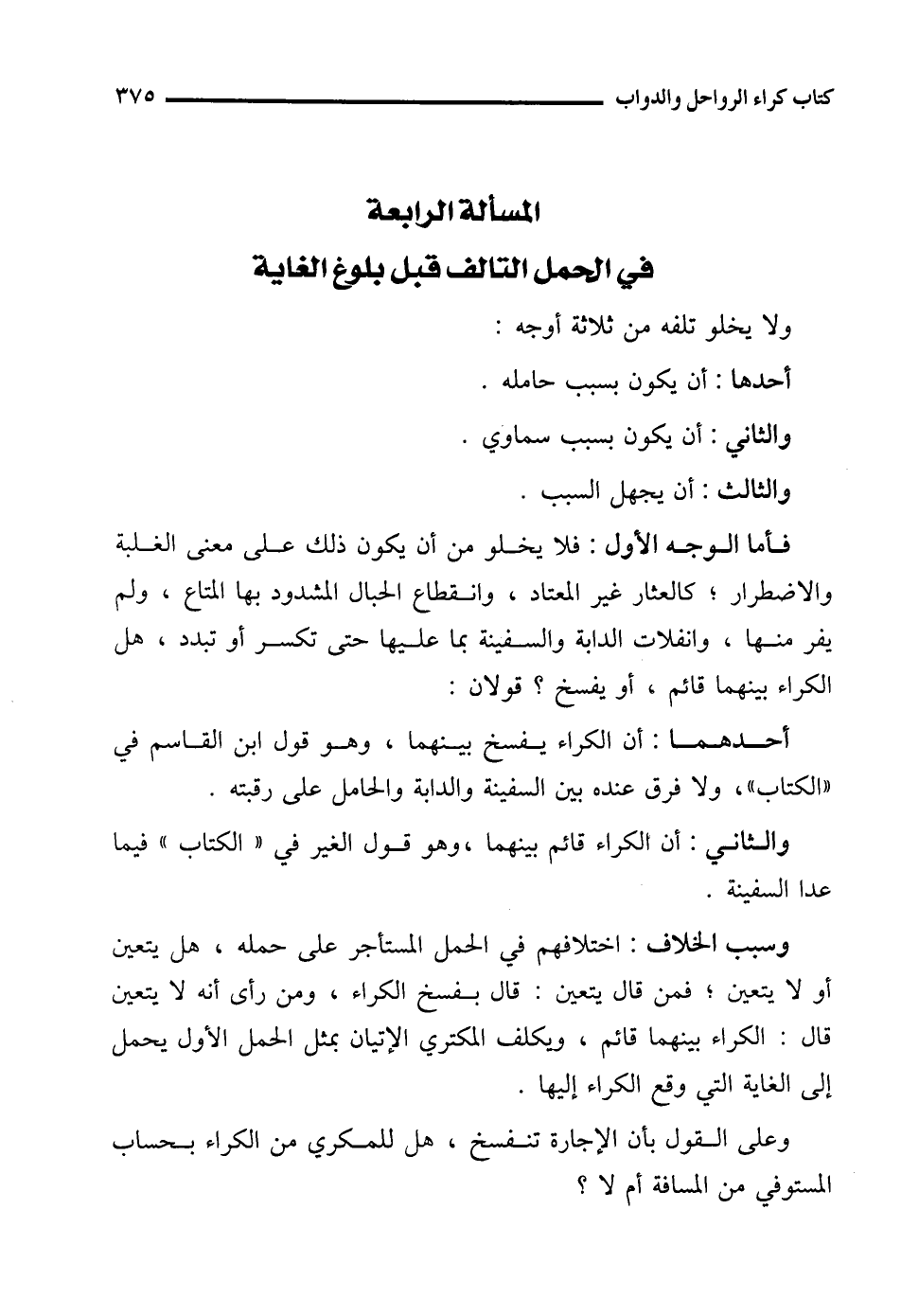 فأما الوجه الأول: فلا يخلو من أن يكون ذلك على معنى الغلبة والاضطرار؛ كالعثار غير المعتاد، وانقطاع الحبال المشدود بها المتاع، ولم يفر منها، وانفلات الدابة والسفينة بما عليها حتى تكسر أو تبدد، هل الكراء بينهما قائم، أو يفسخ؟ قولان: