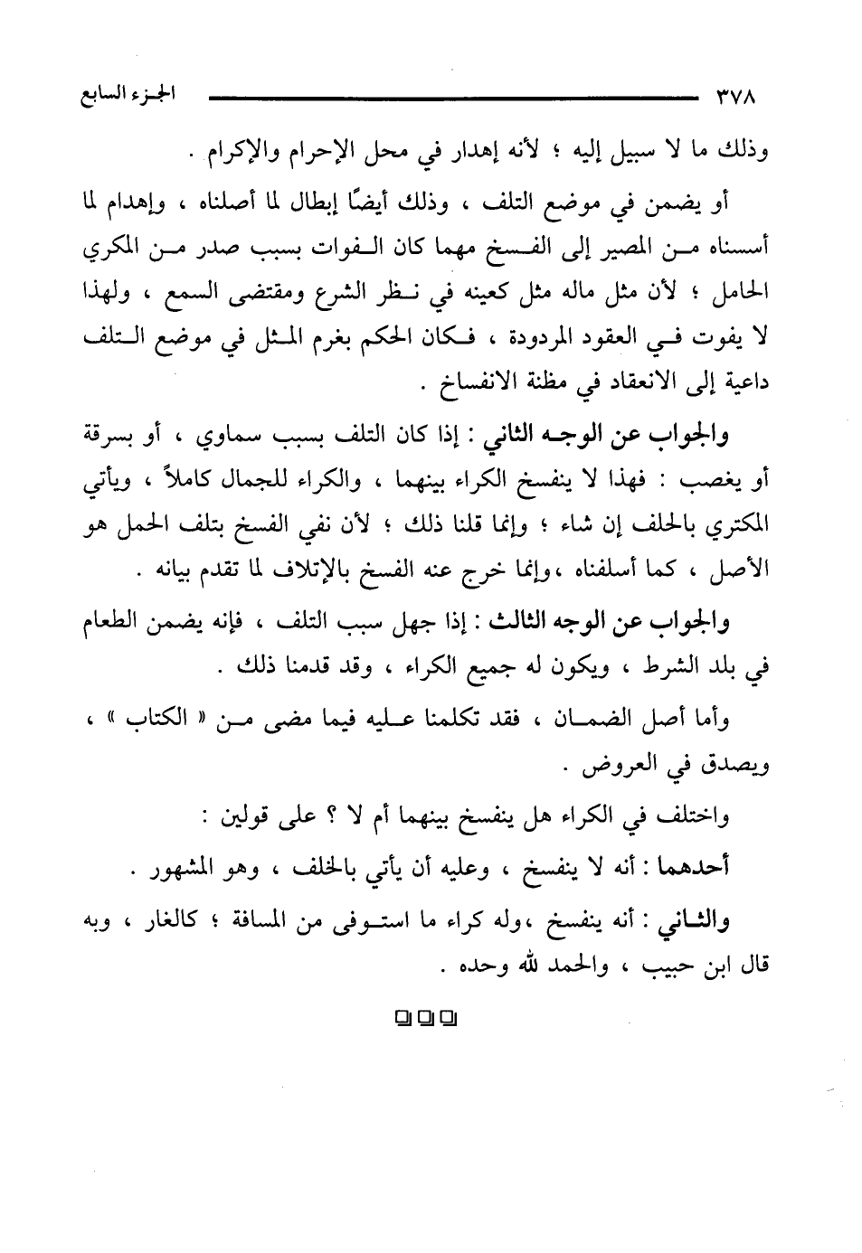 والجواب عن الوجه الثاني: إذا كان التلف بسبب سماوي، أو بسرقة أو يغصب: فهذا لا ينفسخ الكراء بينهما، والكراء للجمال كاملًا، ويأتي المكتري بالحلف إن شاء؛ وإنما قلنا ذلك؛ لأن نفي الفسخ بتلف الحمل هو الأصل، كما أسلفناه، وإنما خرج عنه الفسخ بالإتلاف لما تقدم بيانه.